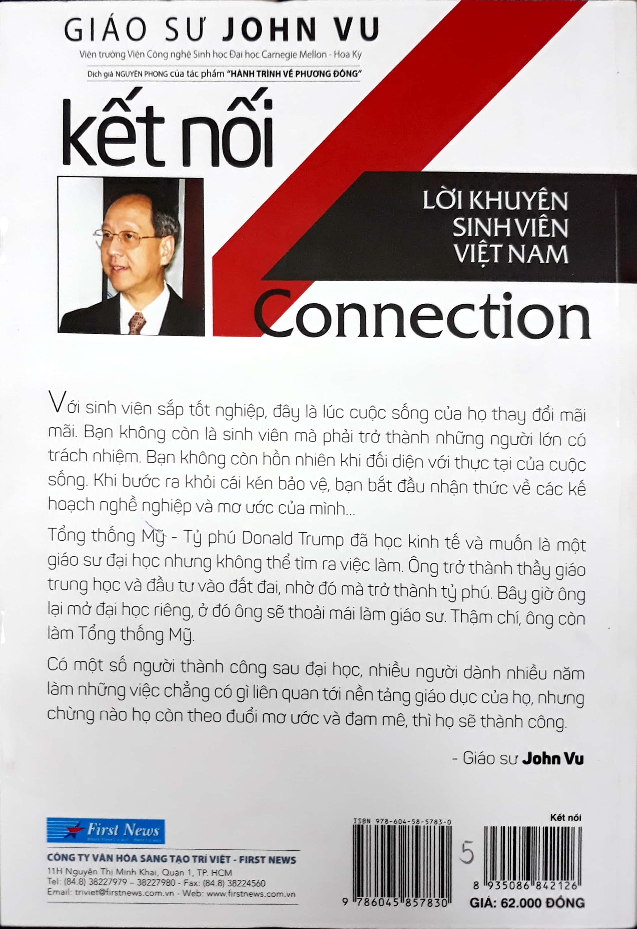 “Kết Nối” là cuốn sách thứ hai trong bộ sách dành cho các bạn trẻ Việt Nam trên con đường lập nghiệp được tuyển chọn từ các bài viết trên trang blog của giáo sư John Vu (). Ở cuốn đầu tiên “Khởi Hành” đã giới thiệu những cách chọn ngành, cách xác định lĩnh vực học tập phù hợp, phương pháp học tập tiến bộ, cách tư duy khoa học và những kỹ năng cần thiết mà sinh viên cần tích lũy trong suốt quá trình học đại học. Và giờ là lúc các bạn bắt đầu thật sự dấn thân vào chuyến hành trình dài nhất cuộc đời, hành trình lập nghiệp. Thế giới thay đổi từng ngày, tìm một chỗ đứng cho bản thântrong xã hội hiện nay không dễ dàng nhưng cũng không phải là điều bất khả. Với tầm nhìn, kinh nghiệm và khát khao giúp đỡ các bạn trẻ trên toàn thế giới tìm thấy hướng đi cho mình, giáo sư John Vu đã nhìn thấy những vấn đề, tìm ra các giải pháp, và mong muốn chia sẻ chúng với tất cả những ai đang cần. Những bài viết trong cuốn sách này rất phù hợp với các bạn trẻ Việt Nam, cung cấp cho các bạn những kiến thức cần thiết để vững bước trên hành trình gây dựng sự nghiệp cho riêng mình. Mong rằng các bạn tìm thấy ở đây câu trả lời cho những khó khăn đang gặp phải, cũng hy vọng các bạn tìm thấy tương lai của mình, góp phần cống hiến cho tương lai đất nước. Cuốn sách “Kết Nối” sẽ mang lại cho các bạn sự chuẩn bị đó. Nếu bạn là sinh viên sắp, hoặc mới tốt nghiệp, đang trên con đường tìm kiếm cho mình một công việc không chỉ để nuôi sống bản thân mà còn nuôi dưỡng những khát khao, hãy đi theo hành trình của cuốn sách này. Hy vọng sau khi đọc qua những trang sách này, các bạn sẽ nhìn thấy những cơ hội đang chờ đợi trước mắt mình và nắm bắt được chúng. Hãy nhớ rằng bất kể bạn đang ở đâu trên thế giới rộng lớn này, cơ hội vẫn luôn mở ra cho bạn, chỉ cần bạn sẵn sàng. hãy trân trọng tuổi trẻ của mình, hãy học tập không ngừng với trái tim nhiệt huyết và tấm lòng thiện lương, vì các bạn không chỉ đang gây dựng tương lai của chính mình, mà còn chịu trách nhiệm với tương lai của xã hội, với đất nước bạn đang sống .