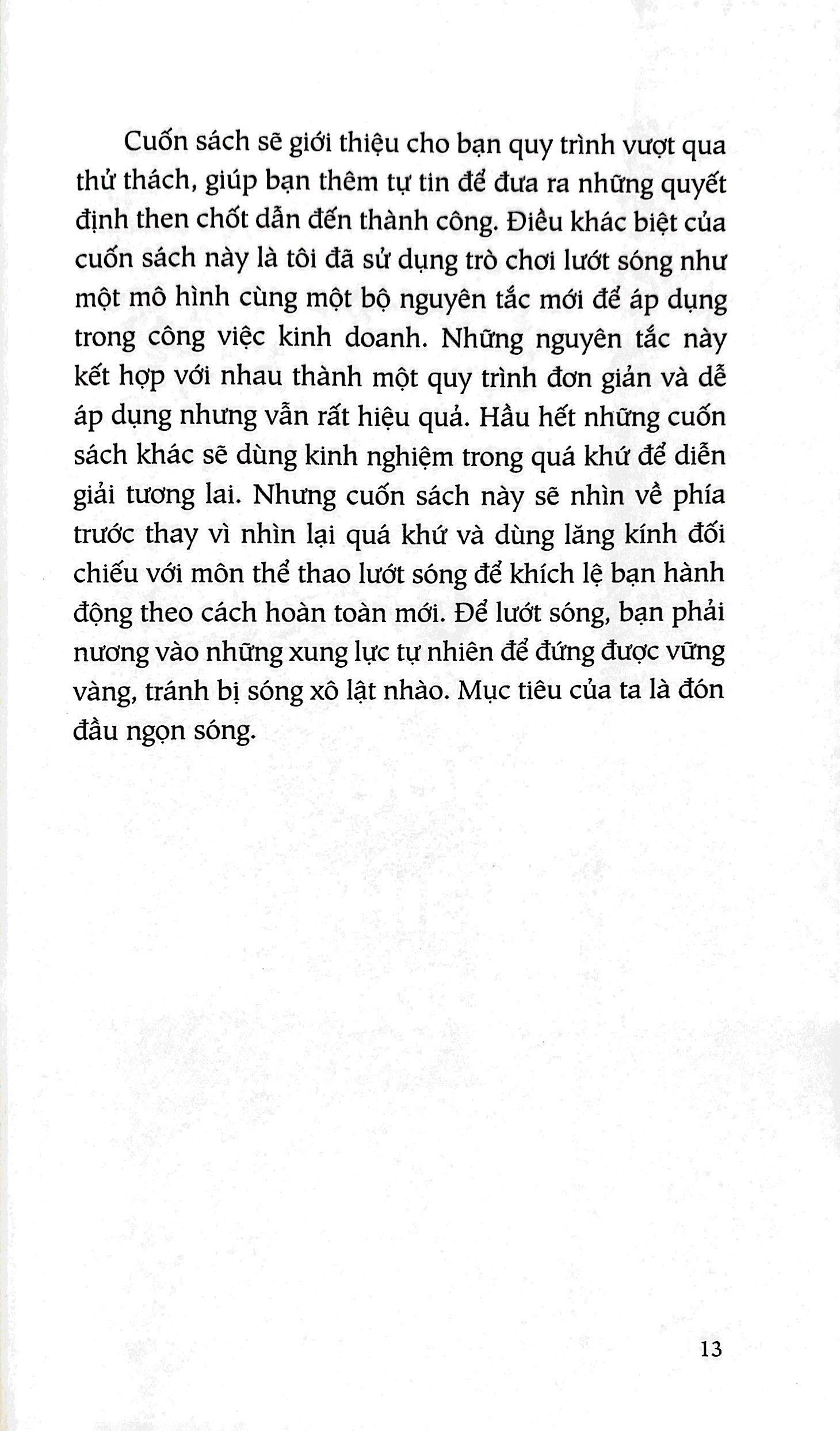 Người ta thường nghĩ lướt sóng là môn thể thao hấp dẫn và đầy kích thích, đòi hỏi người chơi không ngừng thử thách bản thân và sẵn sàng đặt m.ình vào rủi ro; còn kinh doanh lại là hoạt động đòi hỏi sự cẩn trọng, điềm tĩnh với những quy trình nghiêm ngặt ít thay đổi, hai lĩnh vực này thoạt nghe không hề liên quan gì đến nhau. Nhưng không hẳn vậy. Với lối viết sáng tạo, cách dùng từ gần gũi và dễ hiểu, tác giả John Wessinger đã vô cùng khéo léo dẫn dắt người đọc đi từ câu chuyện lướt sóng đến câu chuyện kinh doanh, chỉ ra những điểm tương đồng và hướng dẫn người đọc áp dụng quy trình KẾT THÂN CÙNG THAY ĐỔI LÀM BẠN VỚI RỦI RO của môn lướt sóng để quản lý những thay đổi và ứng phó với rủi ro trong môi trường doanh nghiệp, nhất là trong ngành bán hàng và tiếp thị. Để thành công trong điều kiện thị trường hiện nay, ta cần biết đón nhận cái mới, thay đổi tư duy về cách xây dựng kỹ năng, bước ra khỏi vùng an toàn, khám phá cơ hội trong rủi ro và làm những điều mới mẻ.