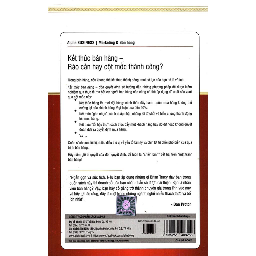 Trong bán hàng, nếu không kết thúc thành công, mọi nỗ lực của bạn sẽ là vô ích. Kết thúc bán hàng – đòn quyết định sẽ hướng dẫn những phương pháp đã được kiểm nghiệm qua thực tế mà bất cứ người bán hàng nào cũng có thể áp dụng để xuất sắc vượt qua cột mốc này: