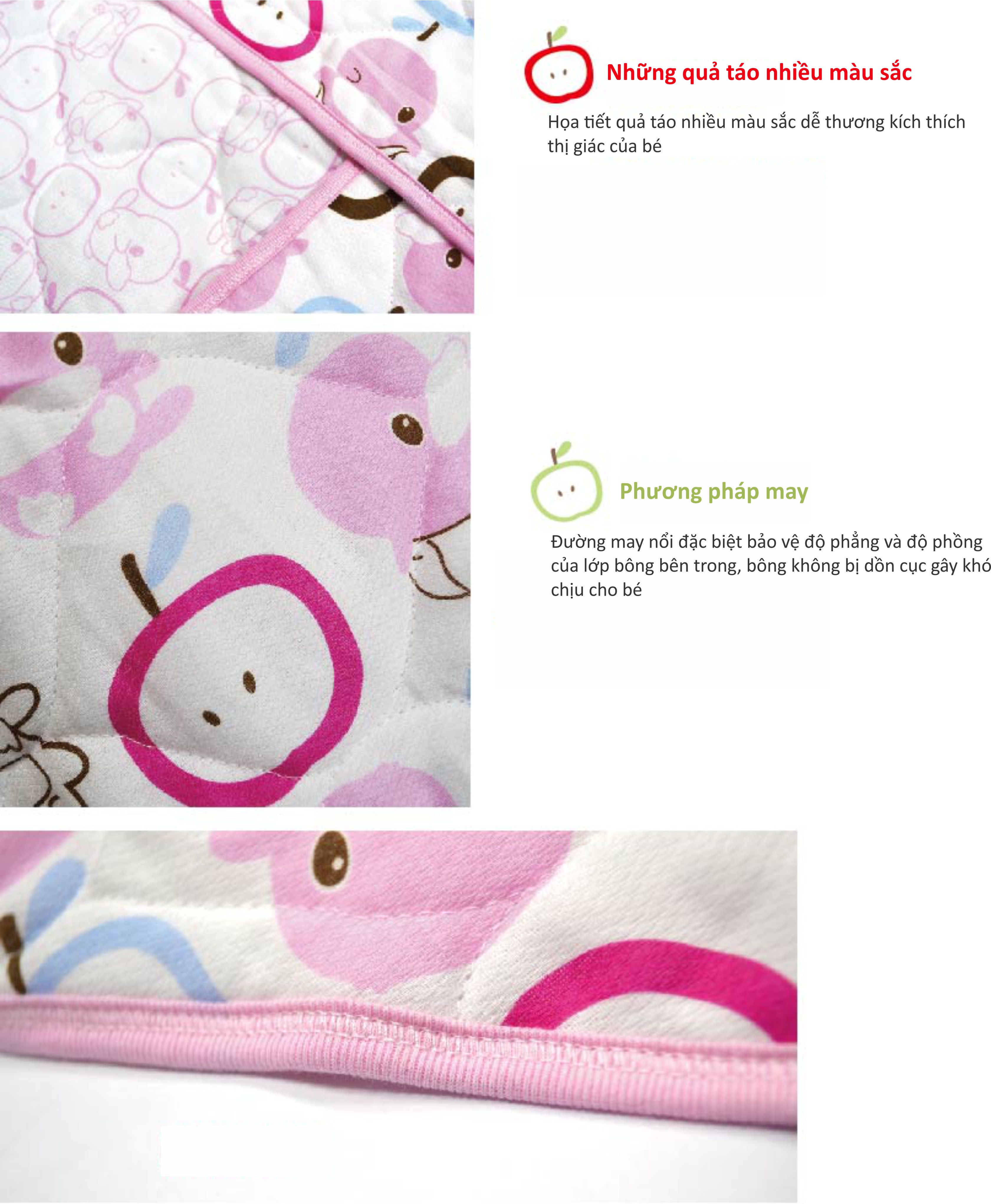 Họa tiết bông hoa được đính trên nền vải gấm khổ lớn ba lớp. Gạc ba mềm và nhẹ sử dụng sợi hữu cơ nhẹ nhàng quấn bé. Ngoài khả năng thoáng khí và hút nước