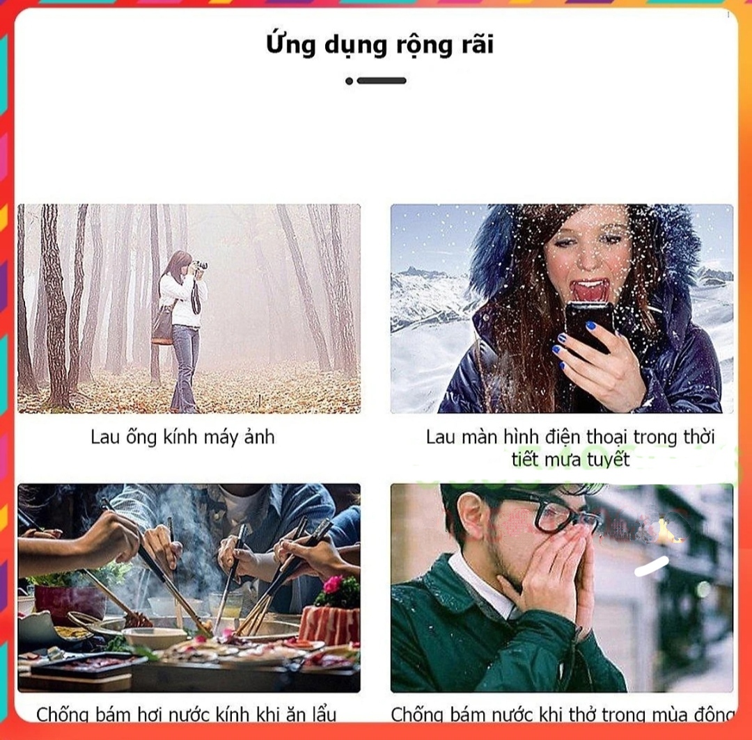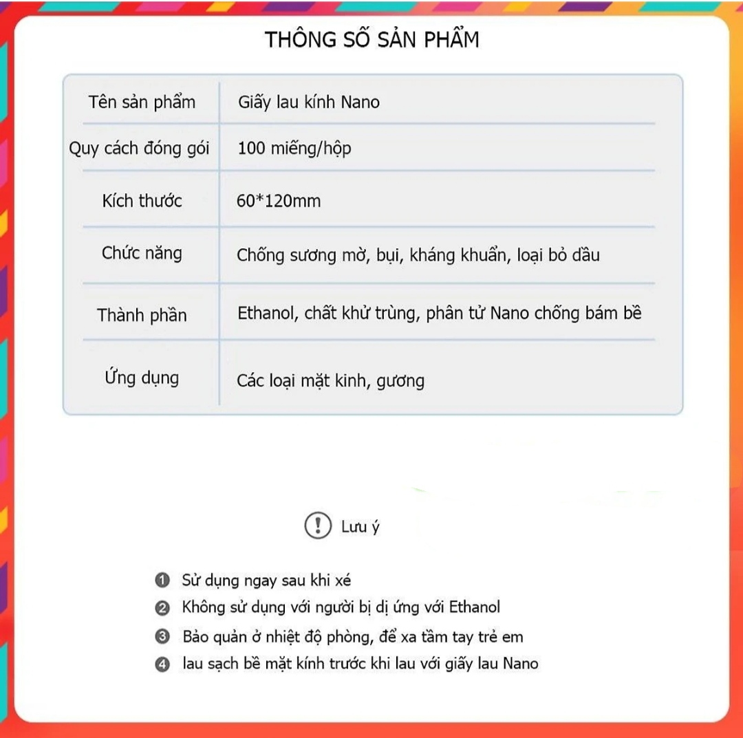 Khăn lau kính Nano hộp 100 miếng khăn giấy chống bám hơi nước, lau sạch nhờn vân tay bụi bẩn trên mắt kính, điện thoại--------------------------------------------------------GIẢI PHÁP KHI MẮT KÍNH BỊ MỜ KHI ĐEO KHẨU TRANG, LÚC ĂN MỲ, ĂN ĐỒ NÓNG, CHƠI THỂ THAOTHÌ ĐÂY LÀ GIẢI PHÁP MÀ Lani MANG ĐẾN CHO BẠN.️ Là phiên bản nâng cấp của những chiếc khăn lau kính chuyên dụng, với công nghệ hiện đại, Khăn Nano là 1 bước đột phá, mang đến rất nhiều tiện lợi cho người đeo kính:1. Thông tin sản phẩmDành cho : mắt kính, Lau ống kính máy ảnh, kính thể thao,kính xe ô tô, thuỷ tinh, thấu kính quang học.- Xuất xứ : Nội địa Trung Quốc- Quy cách : Hộp 100 tờ- Loại bỏ bụi bẩn và làm sạch mắt kính, bảo vệ mắt kính. Chống bám bụi quay trở lại.- Là loại khăn mềm, ướt, làm sạch triệt để và nhẹ nhàng.- Với thành phần chống dầu mỡ đặc biệt. Đảm bảo làm sạch mắt kính chống tĩnh điện và ngăn ngừa mờ sương.- Thích hợp dùng để lau tất cả các vật dụng liên quan đến kính.- Tất cả các ống kính làm bằng thủy tinh và nhựa- Lớp phủ chống phản chiếu …- Các thiết bị như máy ảnh, điện thoại di động, TV, máy tính và màn hình- Mũ bảo hiểm kính che mặt, xe gương…- Thời gian tác dụng lên tới 6 > 10 tiếng/1 lần lau2. Công dụng:GIẤY LAU KÍNH PHỦ NANO GIÚP LÀM SẠCH VÀ BẢO VỆ KÍNH - Giấy lau kính loại bỏ bụi bẩn, nhờn, mồ hôi làm sạch các loại mắt kính- Mỗi miếng giấy có tẩm dung dịch cồn lau sạch mắt kính sáng bóng, trong veo, bảo vệ tầm nhìn của mắt .- Ngoài công dụng lau mắt kính ra, sản phẩm còn rất ứng dụng khác như làm sạch màn hình điện thoại , màn hình máy tính , TV, LAPTOP,mặt kính đồng hồ , máy tính bảng & đặc biệt làm sạch được cả Lens ống kính máy ảnh .- Kích thước nhỏ gọn, dễ dàng cất giữ, mang theo.3.HƯỚNG DẪN BẢO QUẢN- Bảo quản ở nơi khô ráo, thoáng mát tránh ánh nắng mặt trời trực tiếp ……