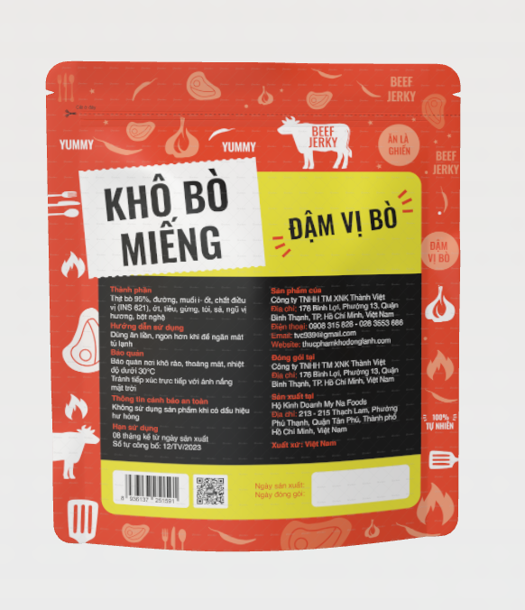 Thành phần: Thịt bò 95%, đường, muối i- ốt, chất điều vị (INS 621), ớt, tiêu, gừng, tỏi, sả, ngũ vị hương, bột nghệ