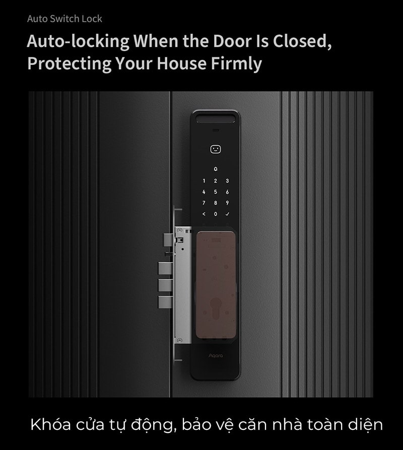 - Chìa khóa cơ Tính năng chống trộm, cảnh báo phá khóa, hết pin Khoá thông minh nhận diện khuôn mặt Aqara D200i có tính năng chống trộm đáng kể. Với tính năng này, khi khóa cửa phát hiện việc cạy khóa bất thường, nó sẽ tự động kích hoạt cảnh báo bằng âm thanh và đèn LED và gửi thông báo đến điện thoại của bạn. Điều này giúp bạn có thể phản ứng kịp thời và ngăn chặn bất kỳ hoạt động trộm cắp nào. Bên cạnh đó khóa có tính năng chống nhìn trộm mã PIN bằng cách nhập số ngẫu nhiên cùng với mã PIN thực tế để tăng cường bảo mật, không để lại dấu vết mã trên bàn phím. Ngoài ra, Khoá thông minh nhận diện khuôn mặt Aqara D200i cũng tích hợp chức năng cảnh báo khi pin yếu, giúp bạn luôn biết được trạng thái của khoá thông minh và có thể thay thế pin kịp thời để đảm bảo an toàn và tiện lợi khi sử dụng. Việc sạc pin cho Aqara D200i rất đơn giản qua cổng USB-C . Mở khóa bằng Home Keys Aqara D200i Smart Lock được tích hợp hoàn toàn với tính năng bảo mật tiên tiến của Home Keys. Kết hợp khóa home vào AppWallet của bạn, Watch của bạn thành chìa khóa thông minh. Chạm thiết bị của bạn vào Aqara D200i để kích hoạt và mở khóa nhanh chóng. Khóa Home yêu cầu (XR hoặc XS trở lên – xem danh sách tương thích ). Hỗ trợ Watch Series 4 trở lên. Tính năng có thể yêu cầu Homehub như TV hoặc Homepod Mini, Homepod… Nhận dạng cực nhanh và chính xác Khóa cửa thông minh Aqara D200i Face ID được thiết kế để phù hợp với nhiều người dùng. Mỗi người dùng có mã PIN riêng biệt, thiết bị NFC và khuôn mặt. Nó có khả năng lưu trữ 50 khuôn mặt, 50 mã PIN và 25 thiết bị NFC. Quản lý người dùng bằng ứng dụng Aqara Home một cách trực quan. Việc thêm hoặc xóa thành viên, mã PIN riêng lẻ, khuôn mặt và thẻ NFC đơn giản và dễ dàng. Cảm biến chuyển động sẽ kích hoạt mô-đun nhận dạng khuôn mặt, đảm bảo phản hồi mở khóa siêu nhanh và tối đa hóa tuổi thọ pin. Tốc độ mở khóa được nghiên cứu: