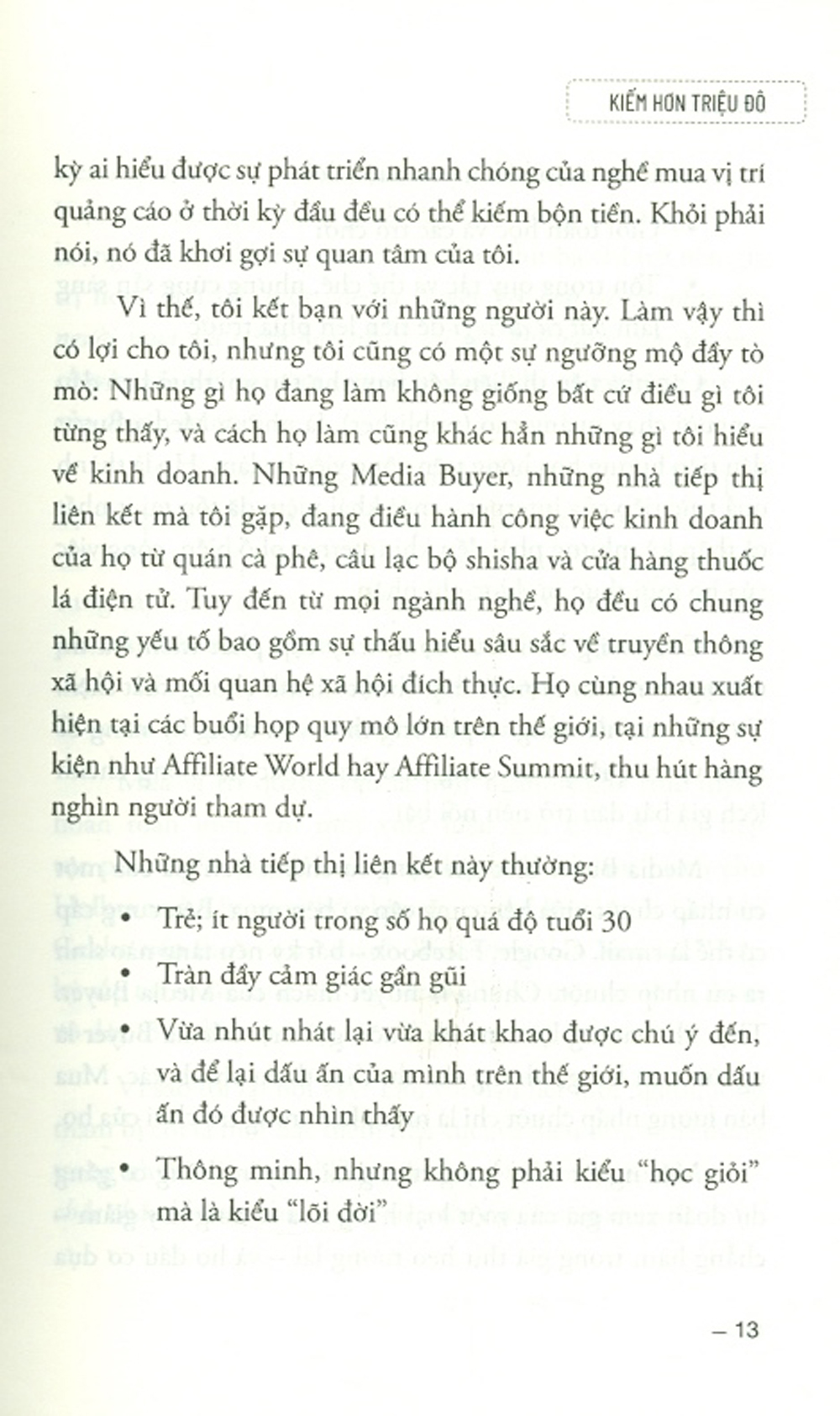 Kiếm Hơn Triệu Đô sẽ chỉ cho bạn những điều cần và phải làm để trở thành một Media Buyer thông qua những chia sẻ, kinh nghiệm, các câu chuyện và những bí kíp của chuyên gia về thương mại điện từ kiêm CEO Bruce Cran. Bạn sẽ học thêm được vẽ nghệ thuật marketing, Affiliate marketing, quảng cáo, và cách thiết kế phễu bán hàng để thúc đẩy doanh số.