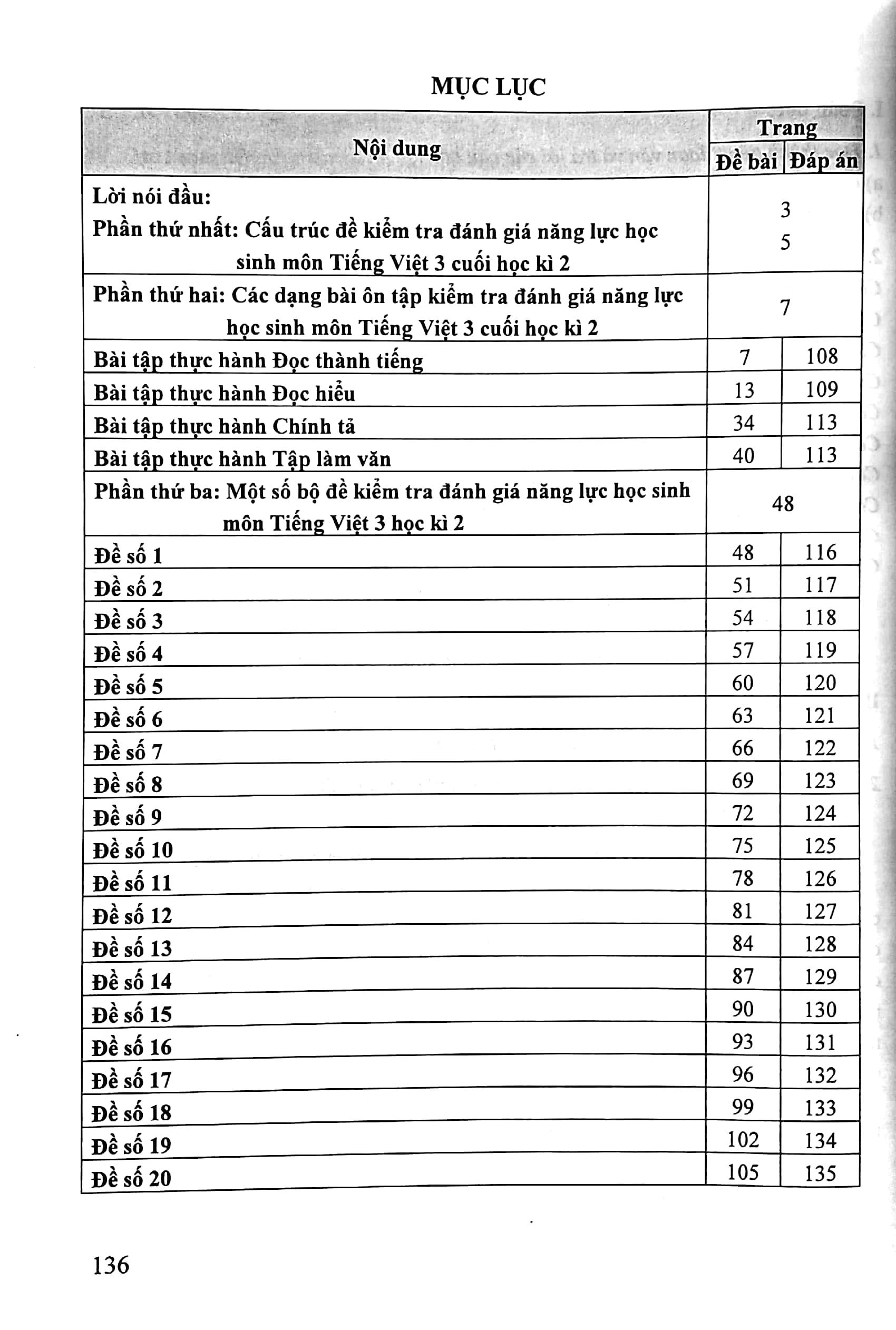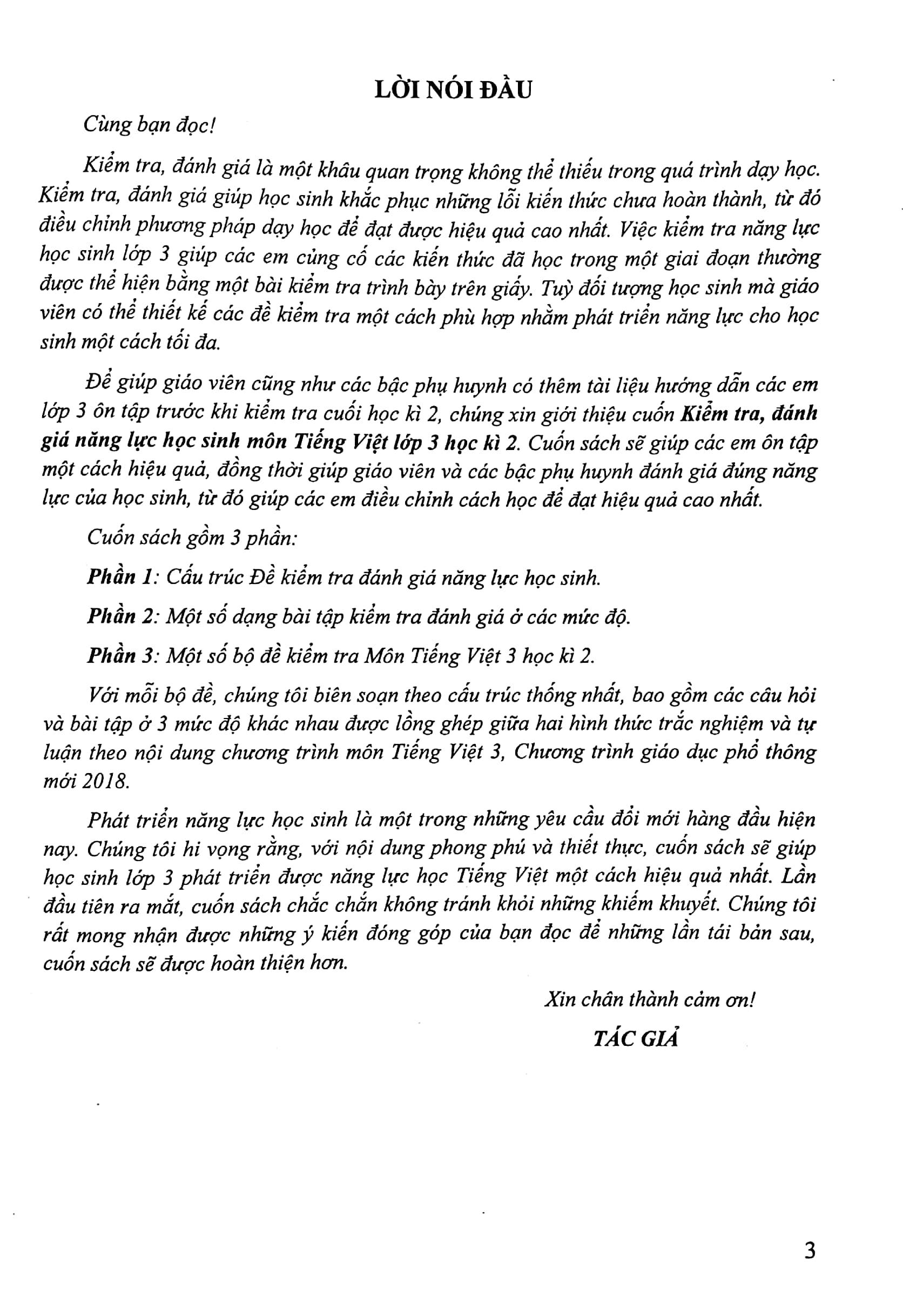 Để giúp giáo viên cũng như các bậc phụ huynh có thêm tài liệu hướng dẫn các em lớp 3 ôn tập trước khi kiểm tra cuối học kì 2, chúng xin giới thiệu cuốn Kiểm tra, đánh giá năng lực học sinh môn Tiếng Việt lớp 3 học kì 2. Cuốn sách sẽ giúp các em ôn tập một cách hiệu quả, đồng thời giúp giáo viên và các bậc phụ huynh đánh giá đúng năng lực của học sinh, từ đó giúp các em điều chỉnh cách học để đạt hiệu quả cao nhất.