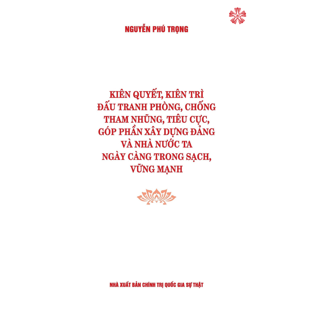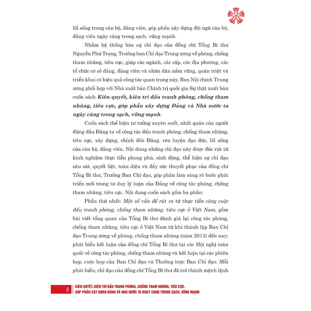 Phần thứ nhất có tiêu đề: “Một số vấn đề rút ra từ thực tiễn công cuộc đấu tranh phòng, chống tham nhũng, tiêu cực ở Việt Nam”, gồm bài viết tổng quan; 4 bài phát biểu kết luận tại các Hội nghị toàn quốc về công tác phòng, chống tham nhũng, tiêu cực các năm 2014, 2018, 2020, 2022 và trích kết luận chỉ đạo của đồng chí Tổng Bí thư Nguyễn Phú Trọng, Trưởng Ban Chỉ đạo Trung ương về phòng, chống tham nhũng, tiêu cực tại 36 phiên họp, cuộc họp của Ban Chỉ đạo, Thường trực Ban Chỉ đạo từ năm 2013 đến năm 2022.