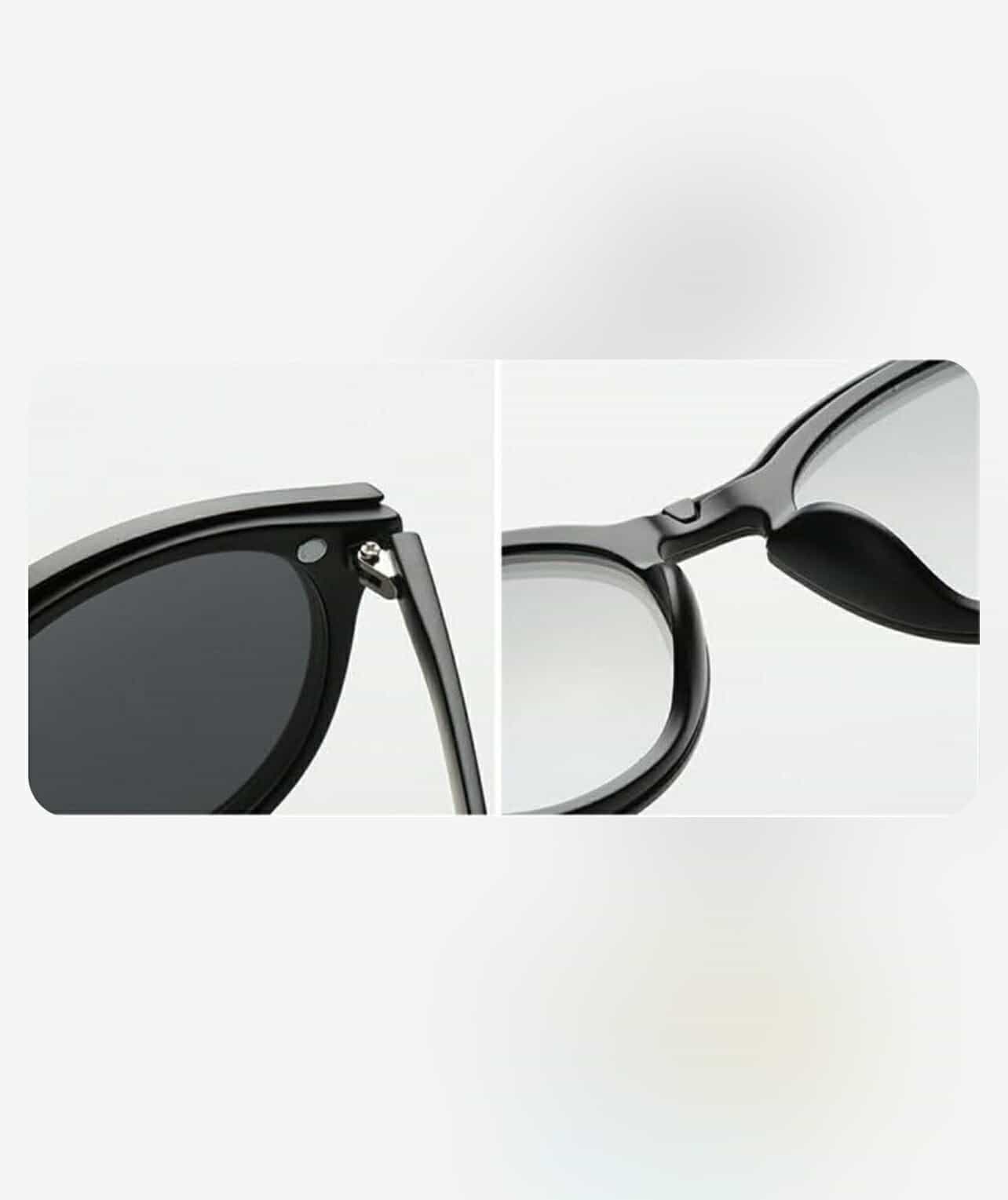 - Gọng kính được làm bằng chất liệu nhựa dầy, mặt sau có 2 nam châm giúp giữ được tròng mát khi lắp lên gọng, ở giữa có 1 chấu để gài tròng