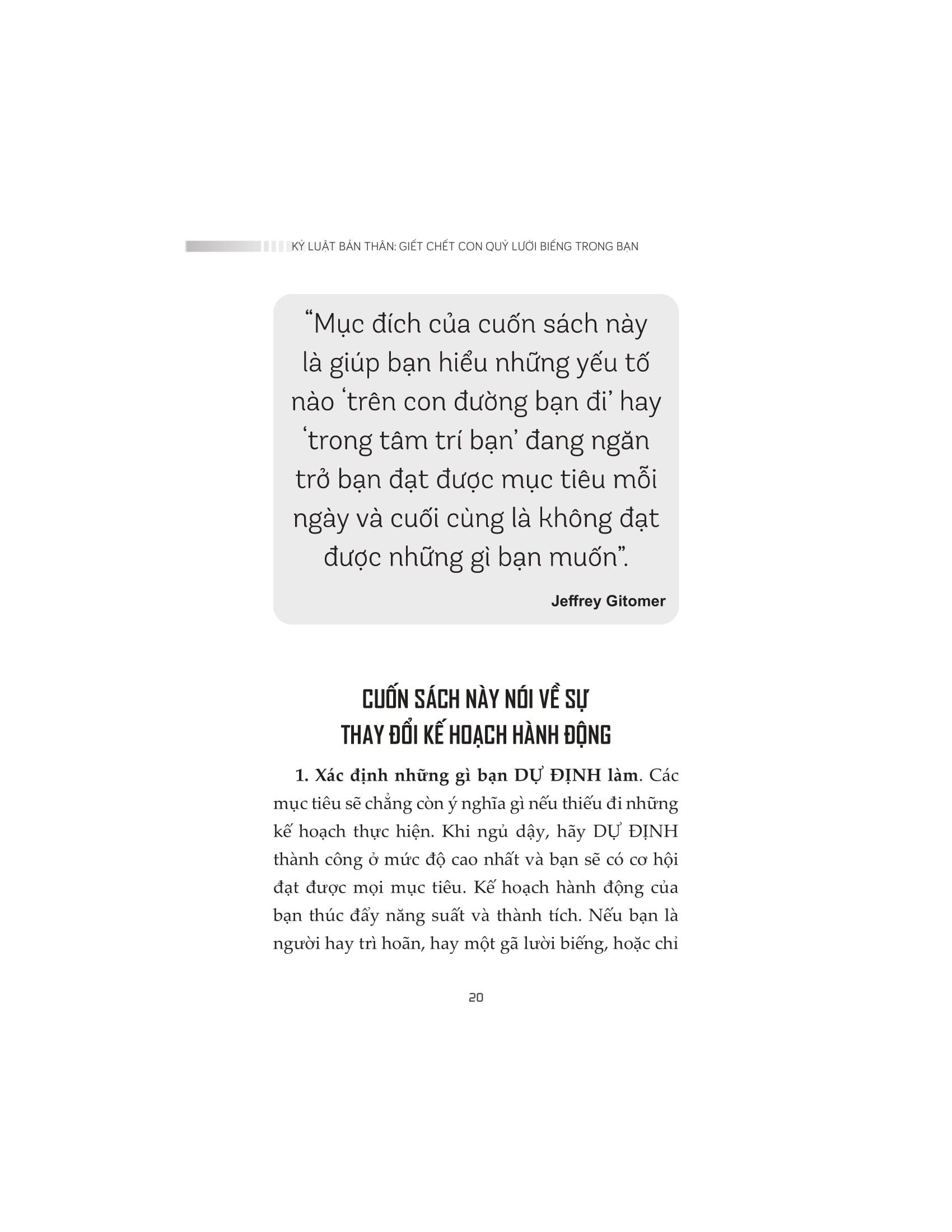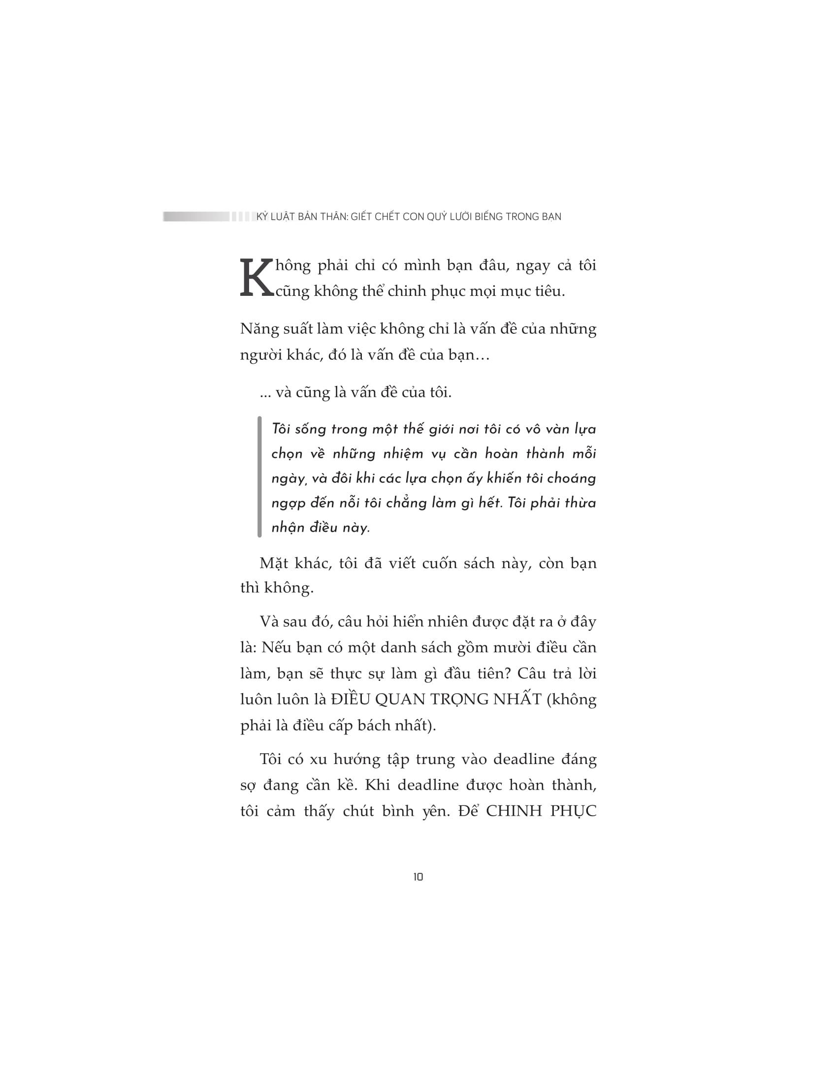 Bạn có muốn làm được nhiều việc hơn, hoàn thành được nhiều mục tiêu hơn, gặt hái được nhiều thành tựu hơn nữa? Tất nhiên câu trả lời là “Có”, tất cả mọi người đều muốn vậy. Nhưng điều gì đang ngăn cản bạn? Có rất nhiều lý do, nhưng thói quen trì hoãn, sự thiếu kỷ luật và các yếu tố gây sao nhãng trong thế giới hiện đại chính là những nguyên nhân hàng đầu. Kỷ luật bản thân: Giết chết con quỷ lười biếng trong bạn không chỉ cho bạn thấy những điều gì đang ngăn cản bạn đạt được kết quả mong muốn, mà còn cung cấp các công cụ và chiến lược để giúp bạn hoàn thành được các mục tiêu một cách tập trung, quyết liệt và hiệu quả cao.