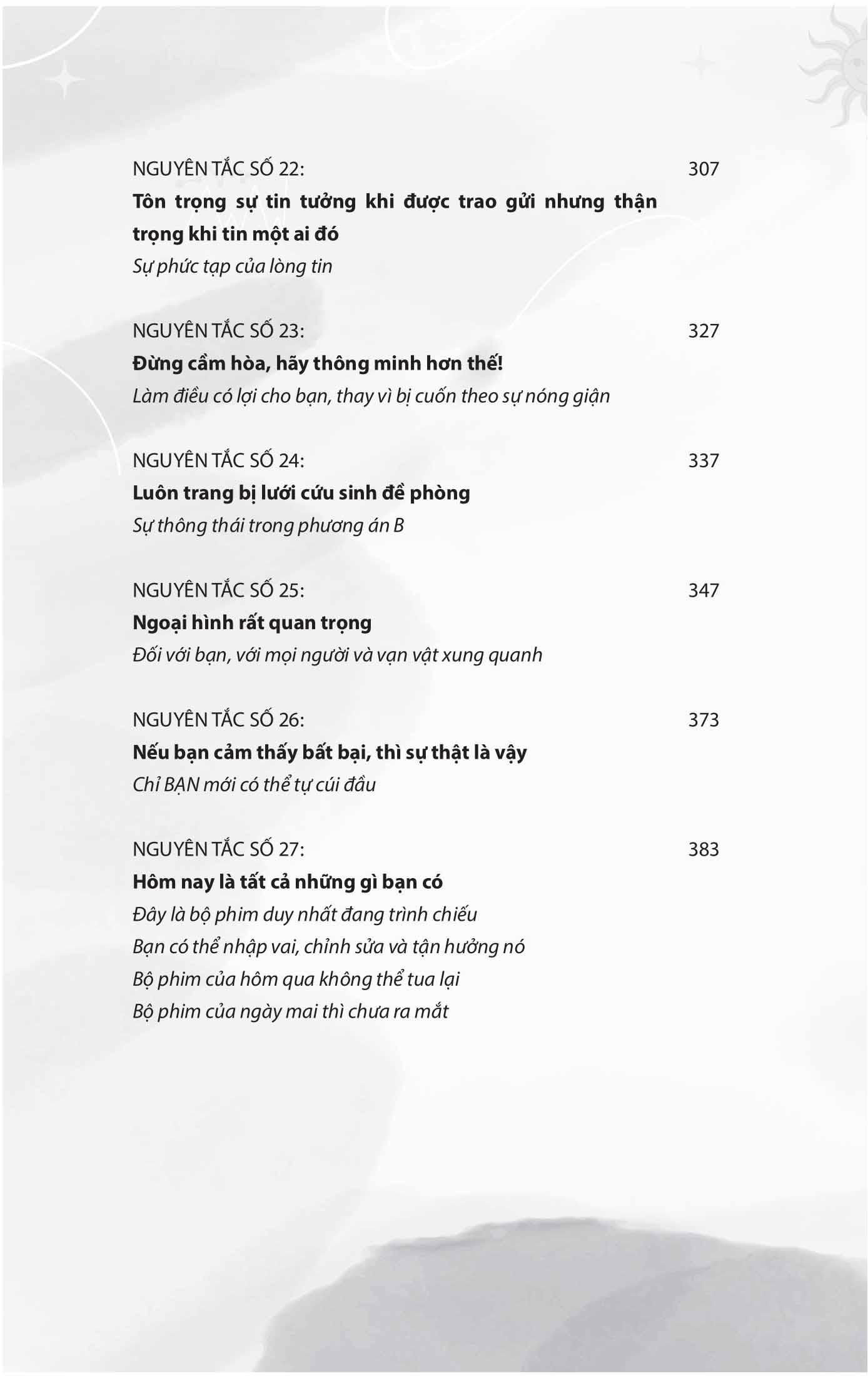 27 chương trong cuốn sách tương ứng với 27 quy tắc giúp bạn thay đổi những thói quen tiêu cực thành thói quen tích cực. Để đảm bảo sự thành công trong sự nghiệp, đạt được sự cân bằng giữa công việc và cuộc sống cũng như nâng cao sự tự tin của bạn.