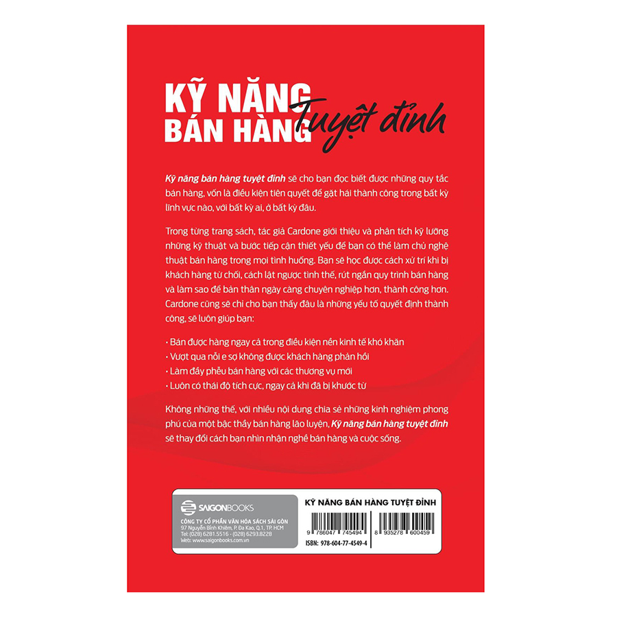 Kỹ Năng Bán Hàng Tuyệt Đỉnh Kỹ năng bán hàng tuyệt đỉnh sẽ cho bạn đọc biết được những quy tắc bán hàng, vốn là điều kiện tiên quyết để gặt hái thành công trong bất kỳ lĩnh vực nào, với bất kỳ ai, bất kỳ ở đâu.   Trong từng trang sách, tác giả Cardone giới thiệu và phân tích kỹ lưỡng những kỹ thuật và bước tiếp cận thiết yếu để bạn có thể làm chủ nghệ thuật bán hàng trong mọi tình huống. Bạn sẽ học được cách xử trí khi bị khách hàng từ chối, cách lật ngược tình thế, rút ngắn quy trình bán hàng và làm sao để bản thân ngày càng chuyên nghiệp hơn. Cardone cũng sẽ chỉ cho bạn thấy đâu là những yếu tố quyết định thành công, sẽ luôn giúp bạn:   Bán được hàng ngày cả trong điều kiện kinh tế khó khăn Vượt qua nỗi e sợ không được khách hàng phản hồi Làm đầy phễu bán hàng với các thương vụ mới Luôn có thái độ tích cực, ngay cả khi đã bị khước từ   Không những thế, với nhiều nội dung chia sẻ những kinh nghiệm phong phú của một bậc thầy bán hàng lão luyện, Kỹ năng bán hàng tuyệt đỉnh sẽ thay đổi cách bạn nhìn nhận nghề bán hàng và cuộc sống.