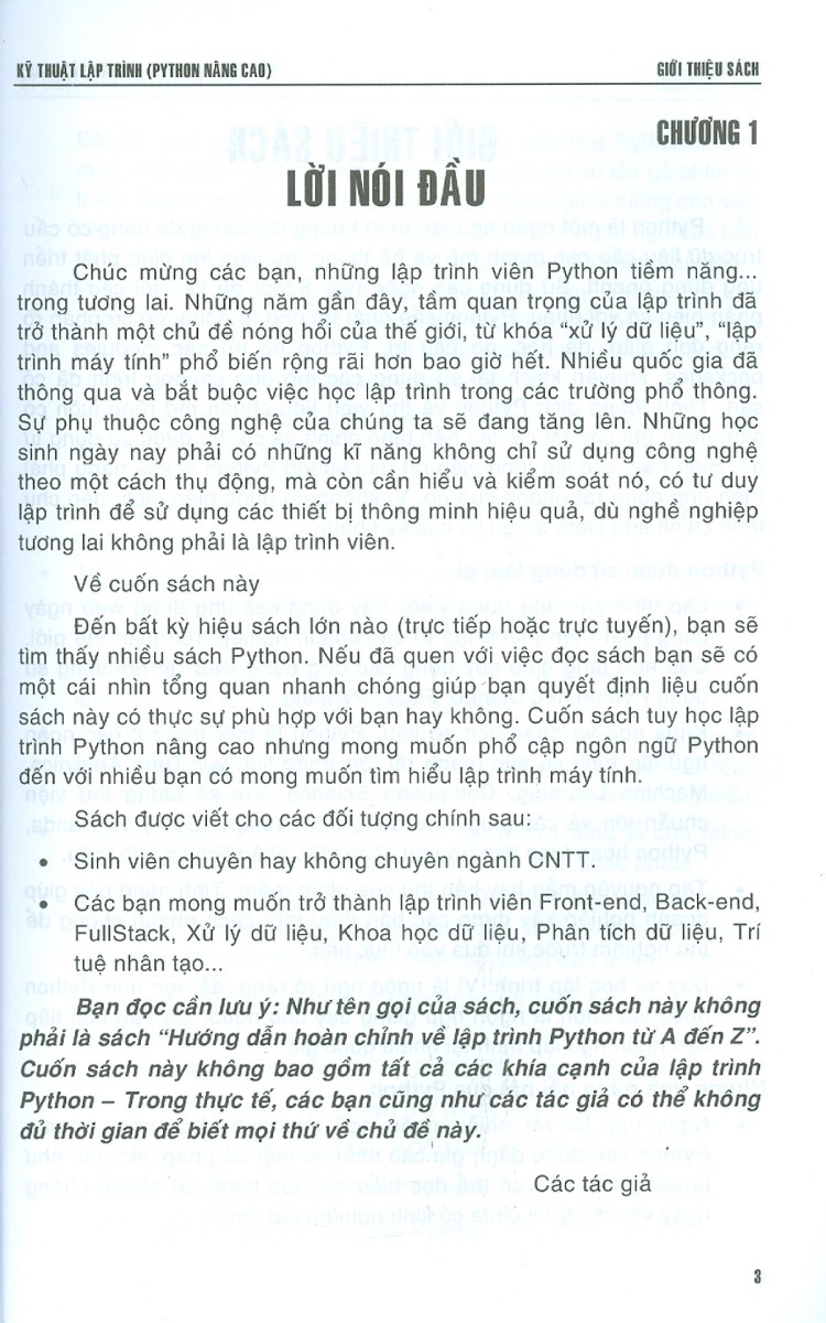 Kỹ Thuật Lập Trình Python Nâng Cao Về cuốn sách này Đến bất kỳ hiệu sách lớn nào (trực tiếp hoặc trực tuyến), bạn sẽ tìm thấy rất nhiều sách Python. Nếu đã quen với việc đọc sách bạn sẽ có một cái nhìn tổng quan nhanh chóng giúp bạn quyết định liệu cuốn sách này có thực sự phù hợp với bạn hay không. Cuốn sách này mong muốn phổ cập ngôn ngữ Python đến với nhiều bạn có mong muốn tìm hiểu lập trình máy tính. Sách được viết cho các đối tượng chính sau: Không yêu cầu người học có kinh nghiệm lập trình trước đó. Học sinh phổ thông. Sinh viên chuyên hay không chuyên ngành CNTT. Các bạn mong muốn trở thành lập trình viên Front-end, Back-end,