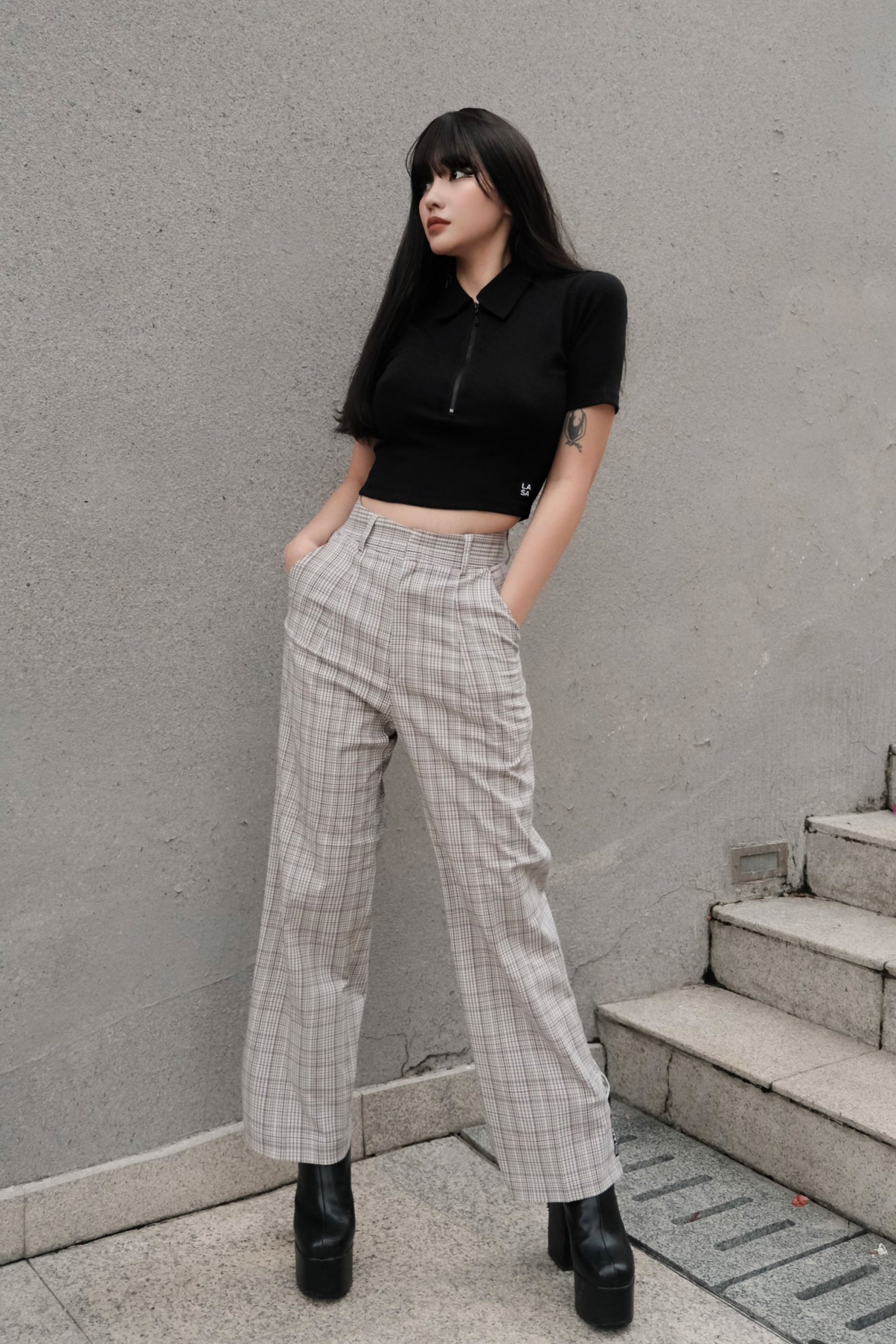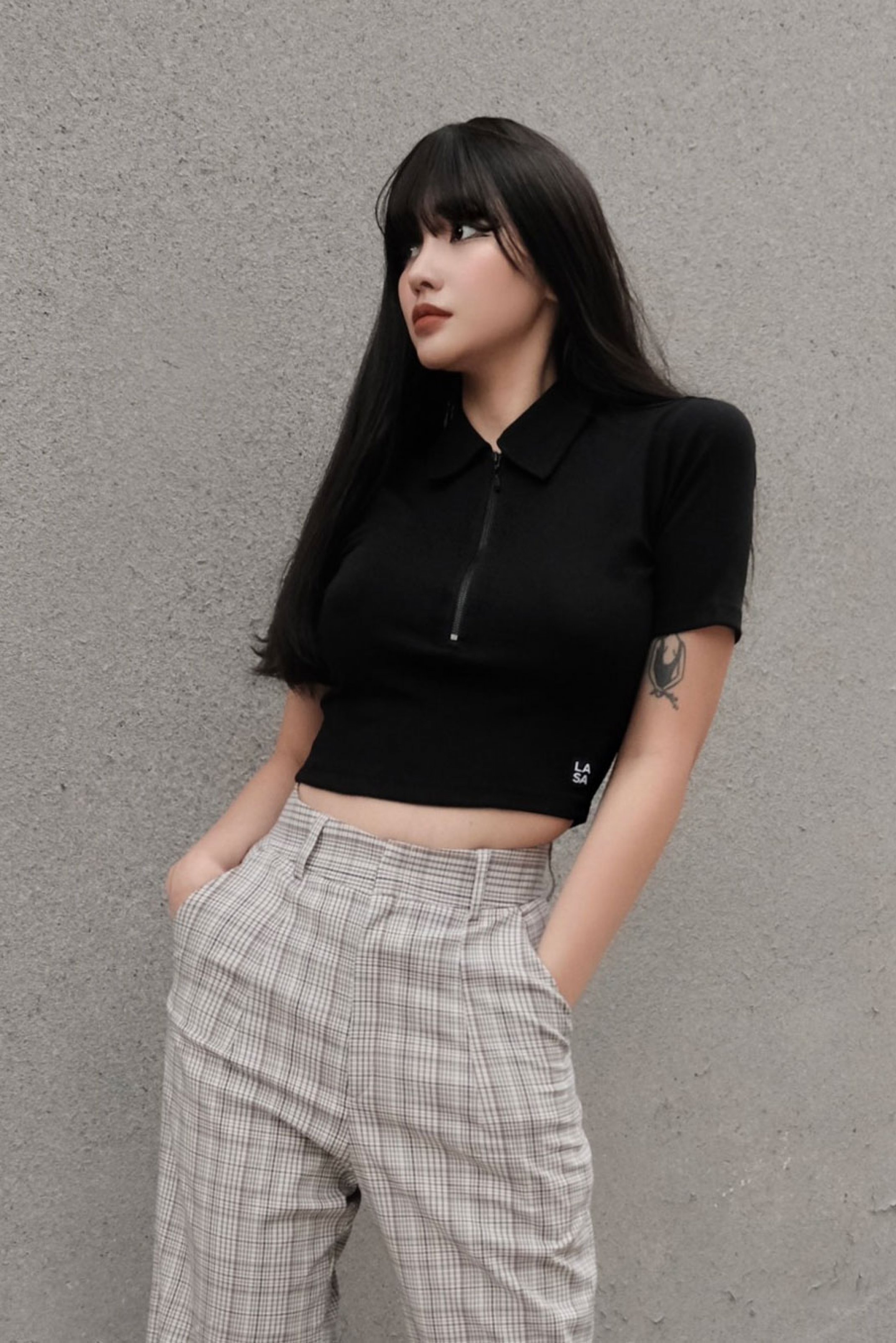 BORIP COTTON 100% 4 CHIỀU, CHẤT DÀY MỀM, THOÁNG MÁT ÁO MÀU ĐEN, CỔ POLO DÂY KÉO SẮT YKK FORM ÔM, TAY NGẮN, CROPTOP ĐIỂM NHẤN TAG LOGO LAAS TRÊN LAI ÁO