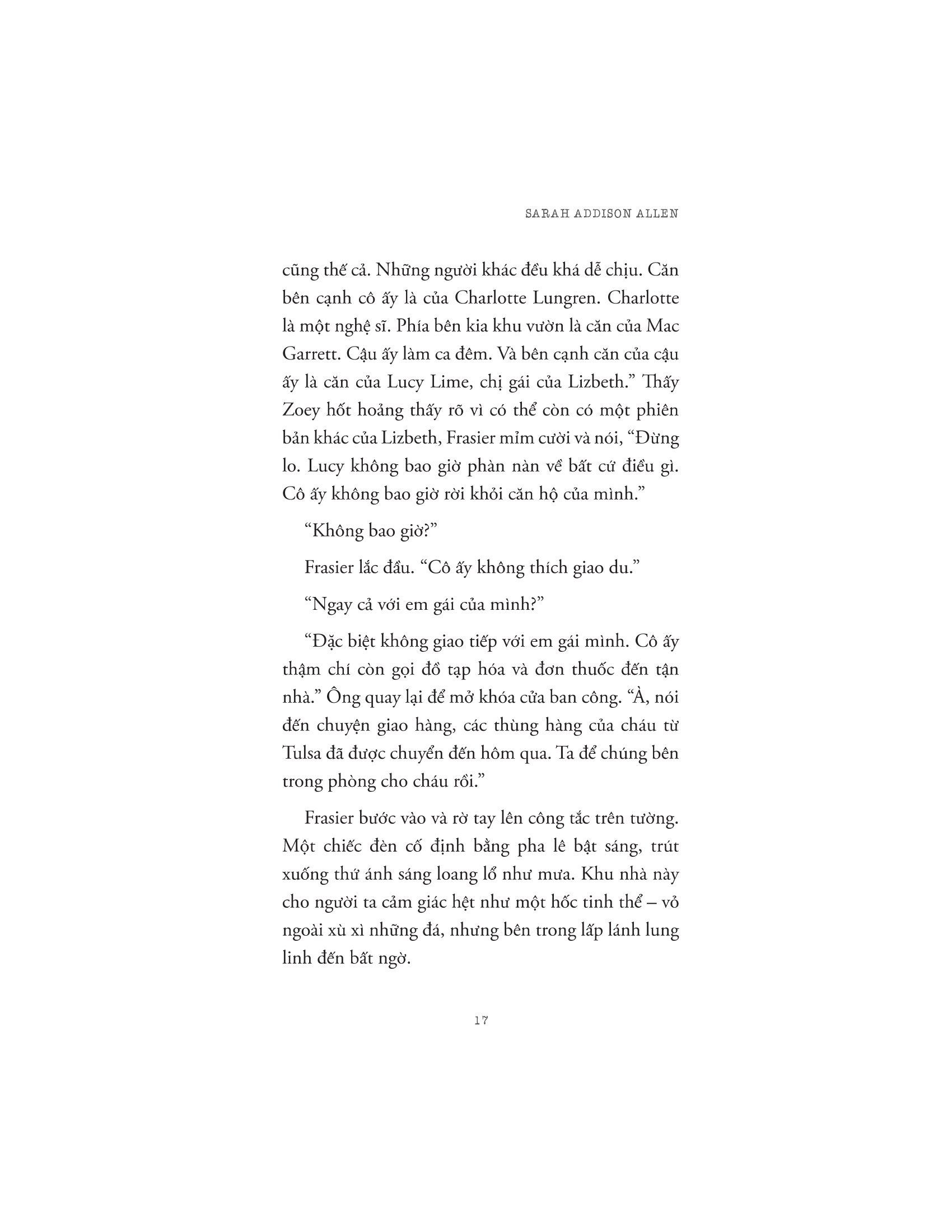 Sarah Addison Allen tốt nghiệp chuyên ngành Văn học Anh của Đại học North Carolina. Sau khi tốt nghiệp, cô thành công ra mắt cuốn sách đầu tay Garden Spells và đạt được tiếng vang lớn. Năm 2011, cô phải tạm dừng việc viết lách vì bị chẩn đoán mắc ung thư vú giai đoạn cuối ở tuổi 39. Hiện bệnh tình của cô đã thuyên giảm. Sách của cô đã được dịch sang 30 thứ tiếng và bán được gần 2 triệu bản.