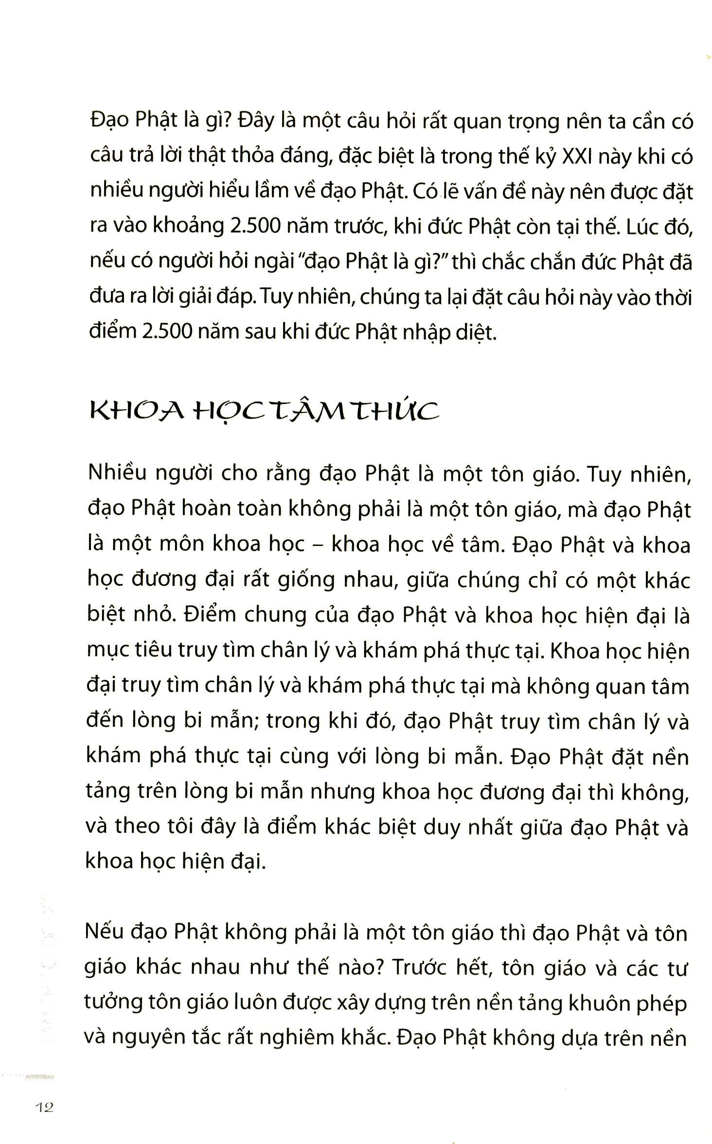 Cuốn sách mở đầu với những tiền đề căn bản, khẳng định đạo Phật là một môn khoa học về bản tâm con người, chứ không đơn thuần là một tôn giáo. Phần thứ hai trình bày bốn sự thật cao quý, là thành quả từ công trình chiêm nghiệm về kiếp nhân sinh của đức Phật trong suốt sáu năm ròng tu khổ hạnh và là nền tảng của toàn bộ lời Phật dạy, và kế tiếp là những chủ đề về thông điệp sống hạnh phúc, lòng từ bi và trí tuệ trong mỗi người.