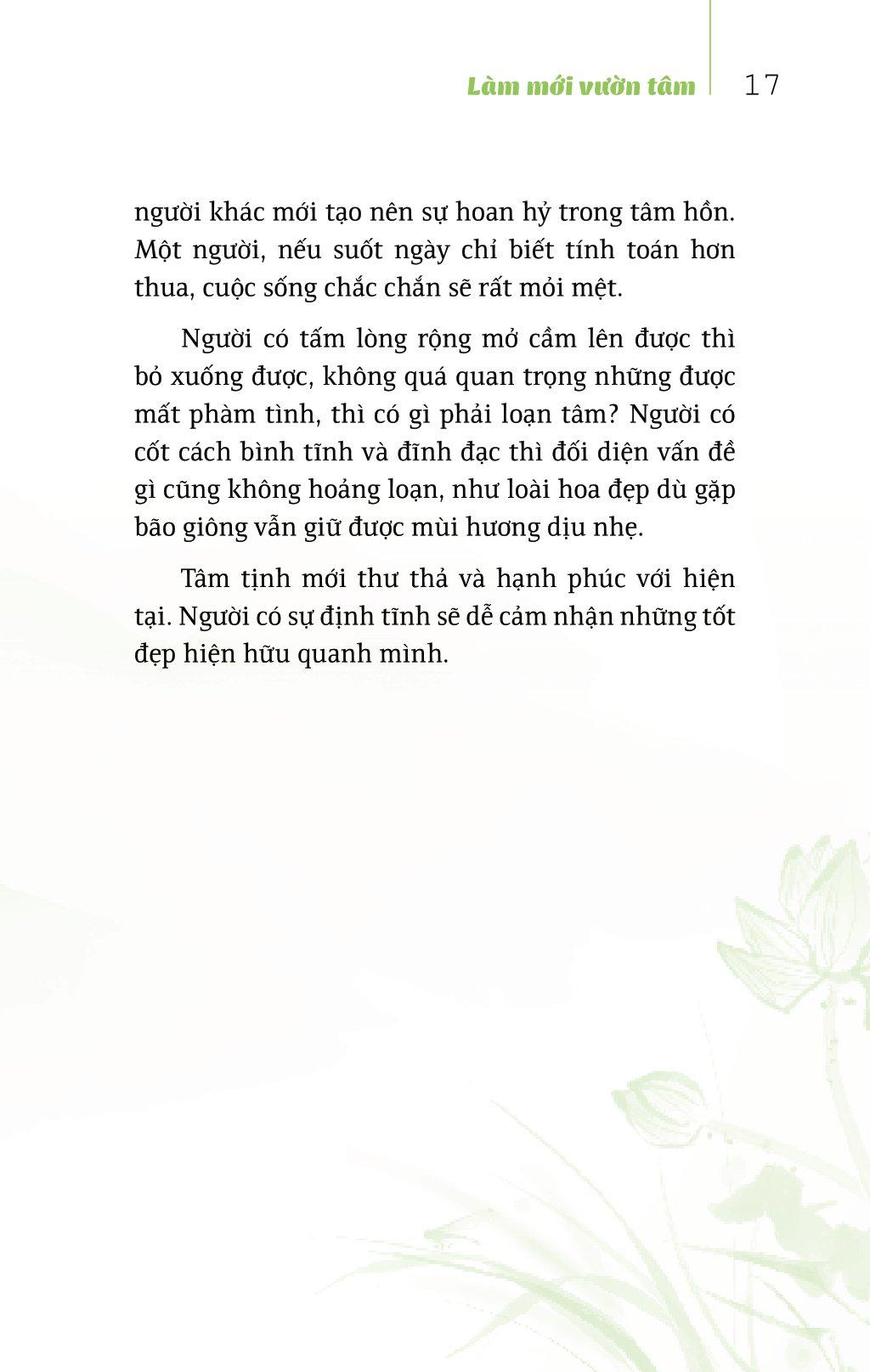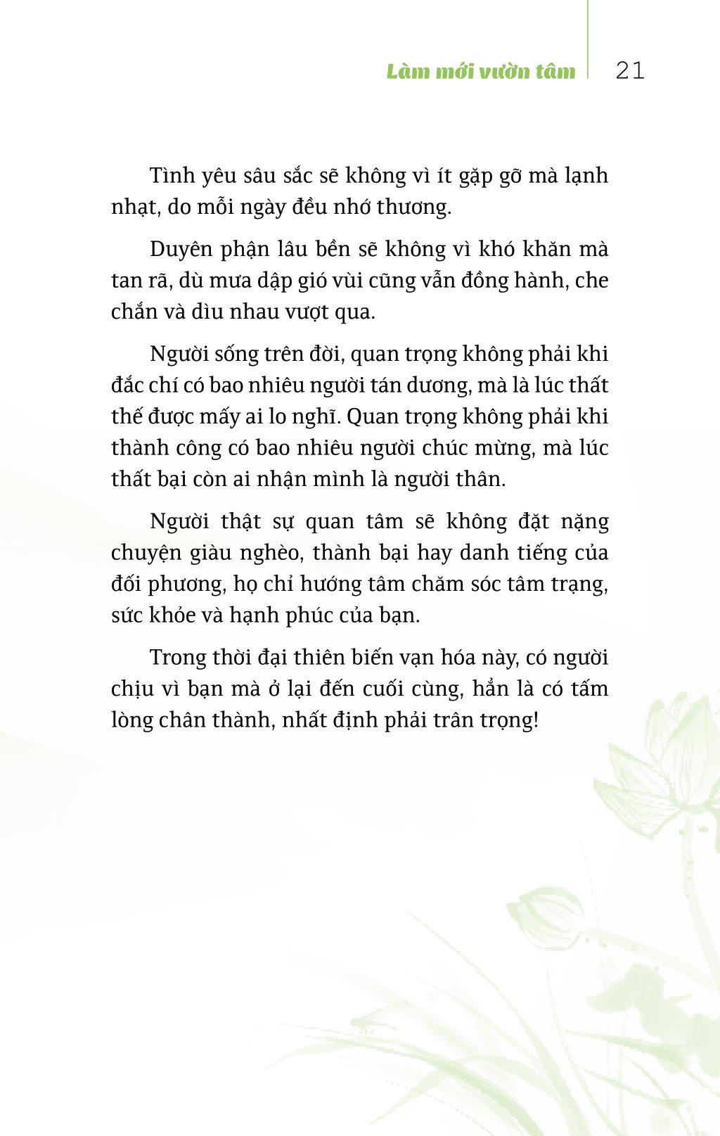 Vì vậy, “làm mới” đã trở thành đòi hỏi thiết yếu của đời sống. Đây là phương thức giúp thăng hoa cảm xúc, thay đổi tâm thái và nâng cao nhận thức cá nhân, để cuộc sống thêm sắc màu và thú vị hơn. Với hy vọng có thể đóng góp chút điều kiện, trợ duyên cho hành trình “làm mới” thân tâm của chúng ta, quyển sách nhỏ Làm mới vườn tâm đã ra đời.