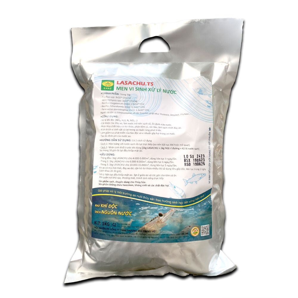 Chế phẩm vi sinh xử lý môi trường ao nuôi Thủy sản VI SINH SIÊU CẤP ! PHÂN GIẢI ĐỘC TỐC. ỔN ĐỊNH MÀU NƯỚC ! Chế phẩm sinh học Lasachu là dòng chế phẩm xử lý môi trường ao nuôi cho Thủy sản cao cấp nhất hiện nay. Đây là đề tài nguyên cứu của các giảng viên, chuyên gia Nông nghiệp hàng đầu của Trường Đại học Nông nghiệp 1 Hà Nội. Trong Chế phẩm này có tổng hợp hàng ngàn tỷ các chủng vi khuẩn có lợi giúp phân giải các tạp chất khó tan thành dễ tan, phân giải độc tố, ổn định màu nước, cân bằng pH và bổ sung dinh dưỡng cho môi trường ao nuôi. [ 1 gói Chế phẩm xử lý tới 5000m3 diện tích ao nuôi ] Vi sinh xử lý ao nuôi tôm, cá LASACHU Thành phần: