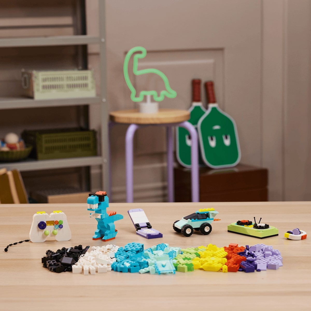 Tạo ra những món đồ thú vị để chơi và trưng bày! Lắp ráp một chiếc tay cầm game, con khủng long đeo kính, chiếc điện thoại có thể mở và đóng, bộ DJ với tai nghe, ván trượt, xe tải quái vật với bánh xe quay và còn nhiều món khác. Kết hợp các mô hình để thêm phần thú vị – ví dụ như đeo tai nghe lên con khủng long và đặt khủng long lên ván trượt!