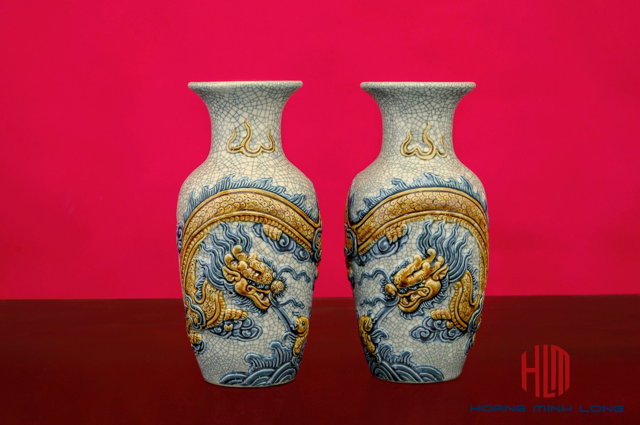 Lọ Lộc Bình Men Rạn Đắp Nổi được làm thủ công bởi bàn tay nghệ sĩ của những nghệ nhân làng gốm Bát Tràng Kích thước: Chiều cao 36cm Phù hợp với những ban thờ