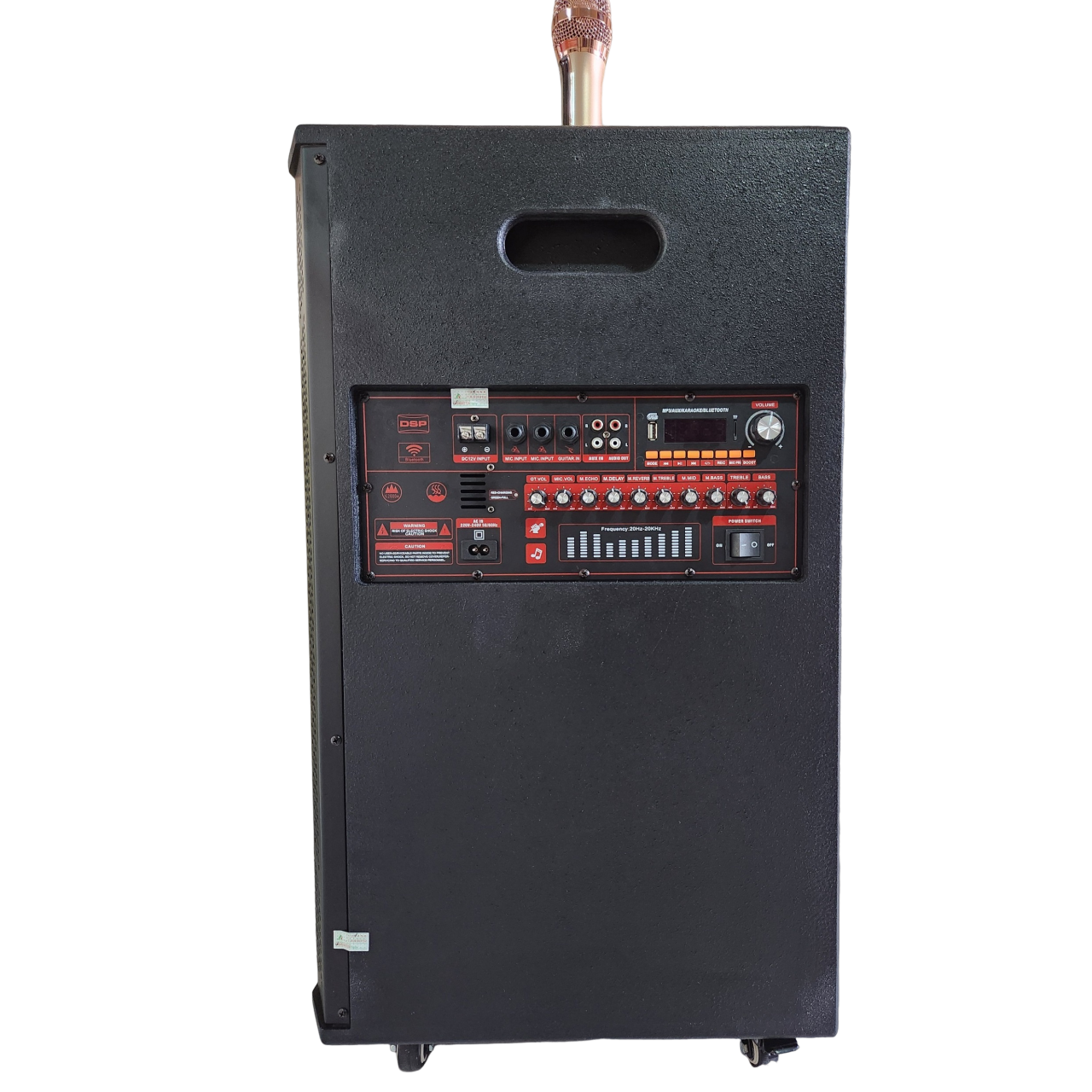 _Nguồn DC 12V bat in _ Bass 2T x 2, Treble x 10 _ Sử dụng bo CLASS D _Hỗ trợ USB, HDMI, Bluetooth, guitar in, mic in _Phụ kiện 2 mic cầm tay không