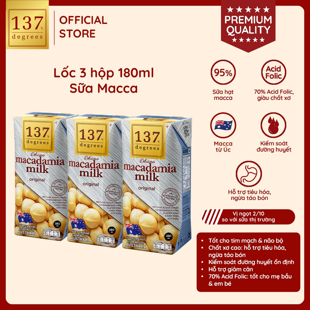 Sữa hạt 137 Degrees là thương hiệu sữa hạt dinh dưỡng số 1 tại Thái Lan, với thành phần hạt tươi nguyên chất đến 99% KHÔNG ĐƯỜNG, KHÔNG CHẤT BẢO QUẢN, KHÔNG PHA TRỘN SỮA BÒ/ SỮA ĐẬU NÀNH, dùng mật hoa dừa hữu cơ tạo vị ngọt thanh nhẹ cho sữa, nguồn hạt hạnh nhân chất lượng từ California, Hoa Kỳ.