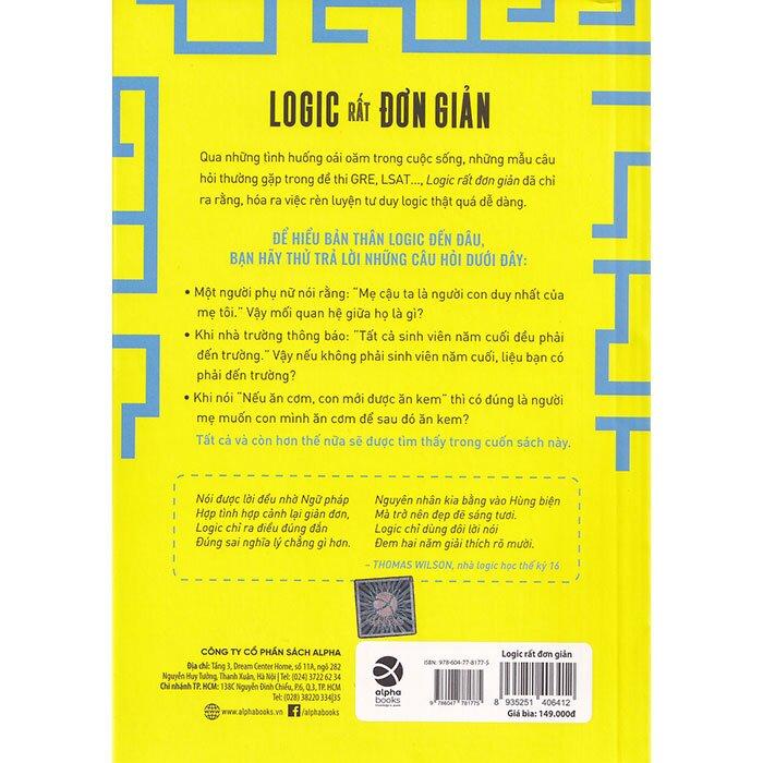 Logic Rất Đơn Giản Qua những tình huống khó khăn cần xử trí trong cuộc sống, những câu hỏi giúp bạn cải thiện điểm thi trong bài GRE, LSAT…, Logic rất đơn giản đã chỉ ra rằng, logic hóa ra không phải là điều bất khả. Cuốn sách này không giống những cuốn sách khác về logic. Ở đây, bạn sẽ hiểu được tại sao tư duy logic lại không hề dễ dàng. Nếu bạn nghĩ m.ình khá logic thì hãy thử một vài câu đố logic mà những người khác thấy khó nhằn. Kể cả nếu bản thân bạn không mắc bẫy tư duy, cuốn sách này cũng sẽ giúp bạn hiểu những khó khăn mà người khác gặp phải. BẠN LOGIC ĐẾN ĐÂU? BẠN CÓ THỂ TRẢ LỜI NHỮNG CÂU HỎI SAU?