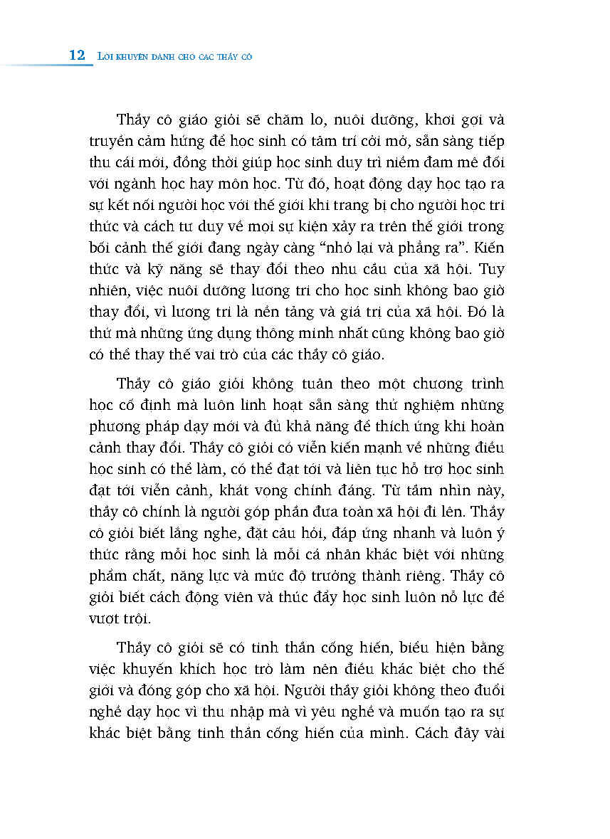 Lời Khuyên Dành Cho Thầy Cô thật sự là một cuốn cẩm nang dành cho các thầy cô giáo trẻ, giúp họ biết cách làm như thế nào để việc giảng dạy đạt hiệu quả tốt nhất, đáp ứng nhu cầu của thế giới không ngừng thay đổi. Ngoài ra, các thầy cô giáo cũng có thể tìm thấy những đúc kết đầy tâm huyết từ kinh nghiệm giảng dạy của GS John Vu như: làm thế nào để học sinh thích học; kinh nghiệm xây dựng môi trường lớp học tích cực; làm thế nào để hướng dẫn học sinh học từ thất bại…