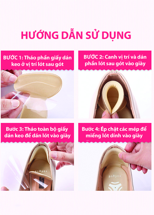 - Đặt lót chống tuột gót vào giày, canh chỉ sát vào gót và dán chặt Lưu ý: Sản phẩm mang thương hiệu buybox có bao bì in logo và hướng dẫn sử dụng chi tiết đi kèm.