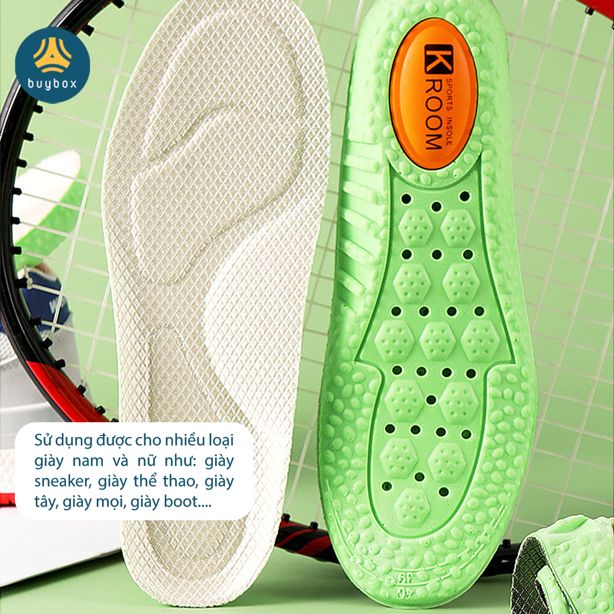 - Lót giày siêu nhẹ không ảnh hưởng trọng lượng giày khi mang cùng. THÔNG TIN SẢN PHẨM Quy cách: 1 cặp 2 miếng dùng cho 1 đôi giày Chất liệu: Bọt silicone, vải mesh Kích thước: 35-36, 37-38, 39-40, 41-42, 43-44, DÙNG KÉO CẮT THEO VẠCH SIZE IN TẠI MẶT DƯỚI ĐỂ CÓ SIZE CẦN SỬ DỤNG. Màu sắc: chỉ có 1 màu be