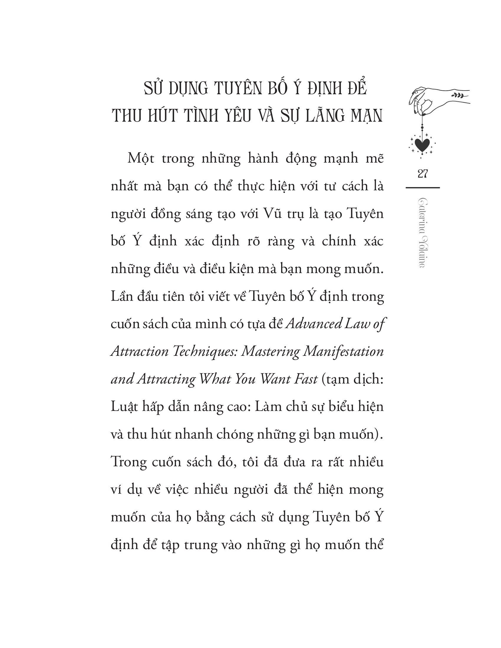 Chương 1: Tập trung thảo luận về sức mạnh sáng tạo của cảm xúc. Bạn có thể sử dụng chúng để tạo ra những điều mà bạn muốn. Hãy làm theo hàng loạt những Tuyên bố Ý định trong cuốn sách để “đánh dấu c.hủ quyền” bằng những yêu cầu cụ thể.
