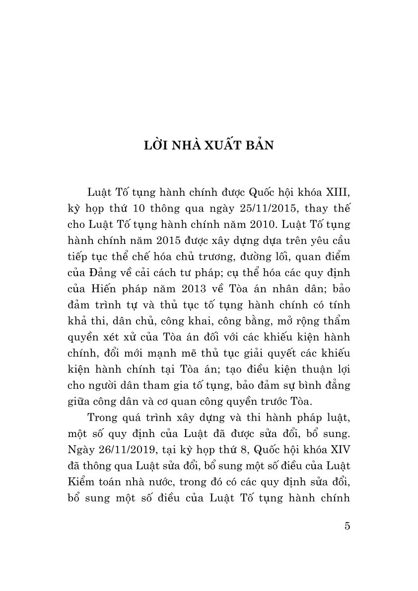 Luật Tố tụng hành chính được Quốc hội khóa XIII, kỳ họp thứ 10 thông qua ngày 25/11/2015, thay thế cho Luật Tố tụng hành chính năm 2010. Luật Tố tụng hành chính năm 2015