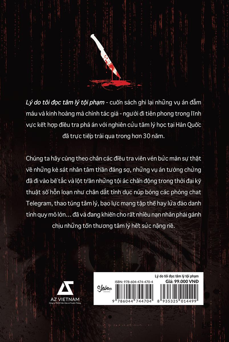 Lý do tôi đọc tâm lý tội phạm - cuốn sách ghi lại những vụ án đẫm máu và kinh hoàng mà chính tác giả - người đi tiên phong trong lĩnh vực kết hợp điều tra phá án với nghiên cứu tâm lý học tại Hàn Quốc đã trực tiếp trải qua trong hơn 30 năm.