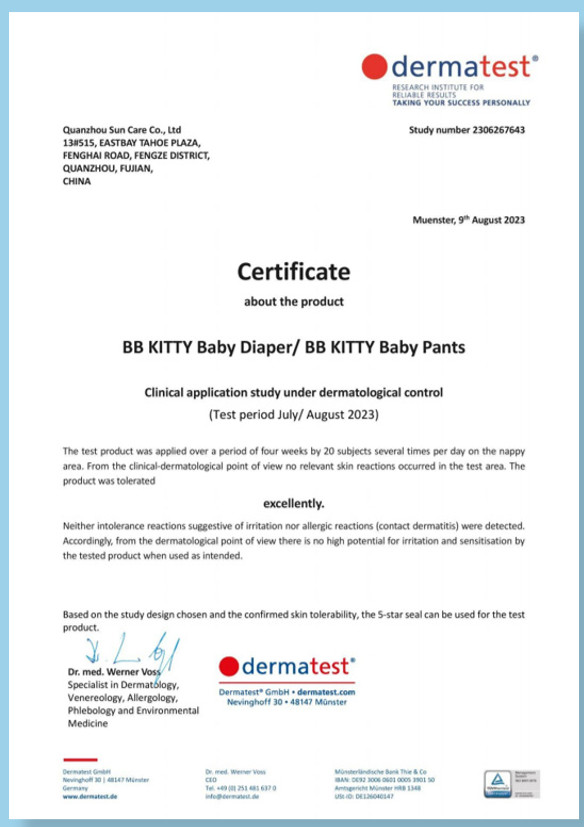- Thiết kế siêu mỏng(2mm) nhưng thấm hút cao(1000ml) làm tã nhẹ và mềm mại cho bé thoả thích chơi đùa mà không lo bí bách. THÔNG TIN THƯƠNG HIỆU BB KITTY là thương hiệu của nhà sản xuất QUANZHOU SUN CARE CO., LTD với các sản phẩm BABY HEALTH CARE đã được đăng kí thương hiệu quốc tế được bảo hộ trên 10 quốc gia theo nghị định thư MARID trong đó có VIỆT NAM với các sản phẩm như: Bỉm, tã trẻ em, khăn giấy, khăn ướt, sữa tắm,ới dây chuyền sản xuất hiện đại(Nhật Bản), qui trình kiểm nghiệm khắt khe(DERMATEST- Đức) mang đến cho khách hàng sự an tâm cho từng sản phẩm. Được nhập khẩu chính ngạch & ủy quyền phân phối tại thị trường Việt Nam - Công ty TNHH xuất nhập khẩu GOONBEE - GOONBEE Store cam kết đem đến sản phẩm 100% chính hãng, chất lượng cao, an toàn và bảo vệ môi trường tới tất cả khách hàng. Cảm ơn các khách hàng đã tin tường và ủng hộ GOONBEE Store! Ngoài ra, BB KITTY còn đạt chứng nhận: