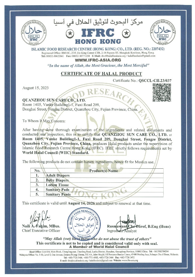- Chứng nhận HALAL( Certificate of HALAL product): Được cấp bởi IFRC HONG KONG - Thành viên của Hội đồng HALAL Thế Giới chứng nhận sản phẩm không chứa thành phần haram phù hợp cho người Hồi giáo sử dụng.