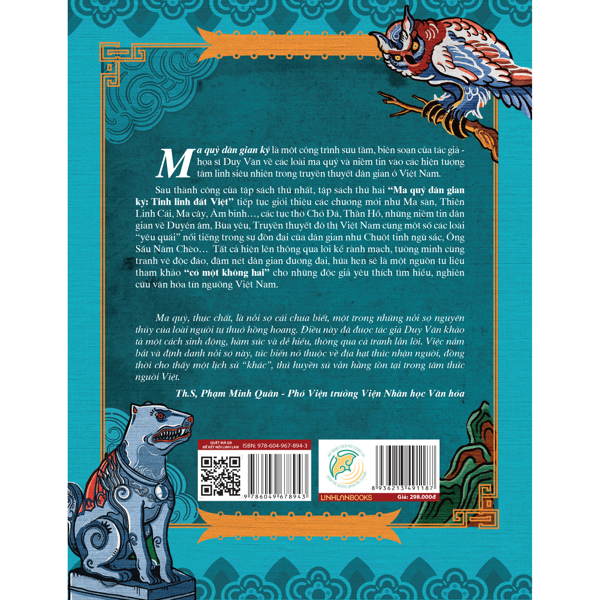 Ma quỷ dân gian ký là một công trình sưu tầm, biên soạn của tác giả - họa sĩ Duy Văn về các loài ma quỷ và niềm tin vào các hiện tượng tâm linh siêu nhiên trong truyền thuyết dân gian ở Việt Nam. Sau thành công của tập sách thứ nhất, tập sách thứ hai “Ma quỷ dân gian ký: Tinh linh đất Việt” tiếp tục giới thiệu các chương mới như Ma sàn, Thiên Linh Cái, Ma cây, m , các tục thờ Chó Đá, Thần Hổ, những niềm tin dân gian về Duyên âm, Bùa yêu, Truyền thuyết đô thị Việt Nam cùng một số các loài “yêu quái” nổi tiếng trong sự đồn đại của dân gian như Chuột tinh ngũ sắc, Ông Sấu Năm Chè Tất cả hiện lên thông qua lời kể rành mạch, tường minh cùng tranh vẽ độc đáo, đậm nét dân gian đương đại, hứa hẹn sẽ là một nguồn tư liệu tham khảo “có một không hai” cho những độc giả yêu thích tìm hiểu, nghiên cứu văn hóa tín ngưỡng Việt Nam. Ma quỷ, thực chất, là nỗi sợ cái chưa biết, một trong những nỗi sợ nguyên thủy của loài người tự thuở hồng hoang. Điều này đã được tác giả Duy Văn khảo tả một cách sinh động, hàm súc và dễ hiểu, thông qua cả tranh lẫn lời. Việc nắm bắt và định danh nỗi sợ này, tức biến nó thuộc về địa hạt thức nhận người, đồng thời cho thấy một lịch sử “khác”, thứ huyền sử vẫn hằng tồn tại trong tâm thức người Việt. Th.S, Phạm Minh Quân - Phó Viện trưởng Viện Nhân học Văn hóa