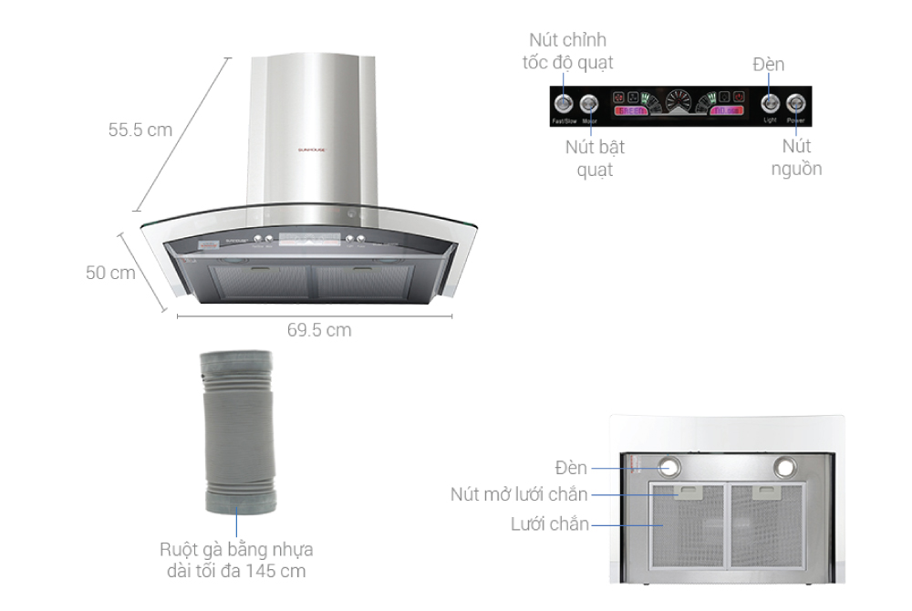- Dễ dàng vệ sinh Kiểu dáng hiện đại với vỏ bằng inox cao cấp Sở hữu thiết kế cong khá độc đáo, Máy hút mùi kính cong Sunhouse SHB6626 còn được làm bằng thép không gỉ nổi bật. Chất liệu này không bám bẩn, không bị oxy hóa (gỉ sét) và dễ dàng vệ sinh, luôn sáng bóng như mới, tăng thẩm mỹ cho ngôi nhà. Lưới lọc bằng nhôm dày dặn & đèn LED siêu sáng Lưới lọc dày ngăn dầu mỡ, mắm muối bắn vào motor và các linh kiện khác gây hỏng hóc, giảm tuổi thọ sản phẩm. Thiết kế dễ dàng tháo rời giúp bạn tiện vệ sinh lưới lọc thường xuyên. Bên cạnh đó là 2 đèn LED có khả năng chiếu sáng tốt giúp cung cấp đủ ánh sáng cho người nội trợ nấu nướng ngon hơn. Bảng điều khiển nút nhấn cùng màn hình hiển thị rõ ràng Bảng điều khiển nằm ngay trước tầm mắt người sử dụng với hệ thống nút nhấn cùng màn hình LED hiển thị rõ ràng, dễ quan sát, dễ sử dụng. Motor siêu bền 2 tốc độ, công suất mạnh mẽ Máy hút mùi kính cong Sunhouse SHB6626 có công suất lớn tới 1100m³ /h, 2 tốc độ hút cho hiệu quả hút mùi tốt ưu lại tiết kiệm điện năng. Mùi dầu mỡ hay các mùi khó chịu khác trong quá trình nấu nướng sẽ nhanh chóng bị hút sạch, không gây ám mùi lên quần áo, các vật dụng nhà bếp hay các không gian liền kề khác (điển hình như thiết kế căn hộ chung cư). Độ ồn thấp Khi hoạt động, máy có độ ồn rất thấp (≤57dB), hầu như không làm ảnh hưởng đến các sinh hoạt khác của gia đình (trò chuyện, xem TV…) Phù hợp nhiều không gian Máy hút mùi kính cong Sunhouse SHB6626 bắt mắt, chất lượng tốt, hút mùi hiệu quả, thích hợp sử dụng trong nhà hàng, gia đình, khách sạn…