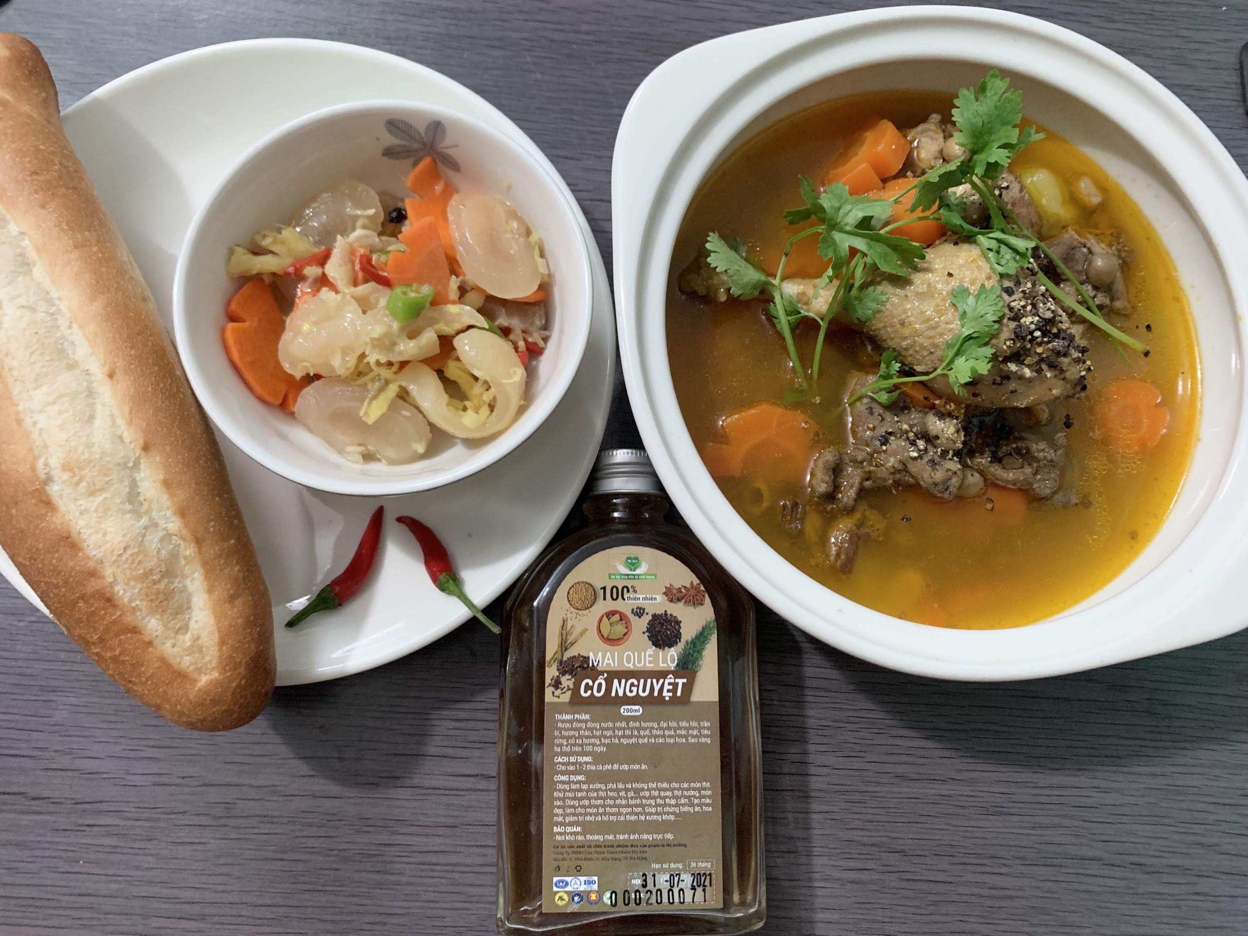 GIA VỊ HOÀN CHỈNH – THỊT KHO LÊ GIA Từ nước mắm cốt đặc biệt và gia vị thiên nhiên chọn lọc (đường hoa mai, nước cốt dừa, tiêu đen, riềng, hành, dứa) với tỉ