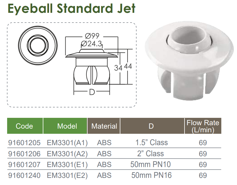 Mắt trả nước Emaux EM3301(A2) phi 60 Mắt trả nước Emaux EM3301(A2) phi 60 Lưu lượng: 4 m3/h Hãng sản xuất: Emaux – China -Mắt trả nước đáy bể là phụ kiện dùng để trả lại lượng nước đã bị hút qua máy bơm từ quá trình lọc tuần hoàn về bể bơi. -Sản phẩm được làm từ vật liệu nhựa ABS. Mắt trả nước được thiết kế từ vật liệu tốt nhất, chịu được hóa chất, chống tia UV. -Mắt trả nước được thiết kế có thể trả nước 360 độ, có thể điều chỉnh tùy thích phù hợp với yêu cầu người sử dụng, hoạt động hiệu quả cho các bể bơi hiện nay.