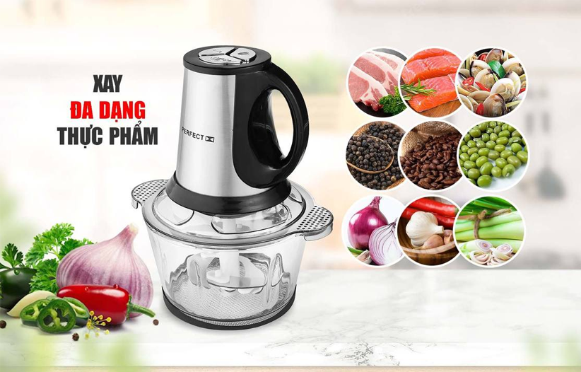 - Bạn có thể sử dụng máy xay thịt Perfect để xay nhiều loại thực phẩm như xay thịt heo, thịt gia cầm, cá và các loại rau quả, gia vị như tỏi, ớt mà không lo mùi thực phẩm bám vào cối sau khi sử dụng. Thiết kế của máy xay đa năng có thể dễ dàng tháo rời, vệ sinh và bảo quản. Đặt biệt có thêm chế độ đánh trứng. Cối thủy tinh trong suốt