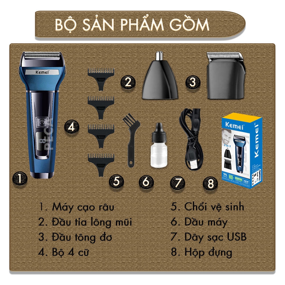 MÁY CẠO RÂU ĐA NĂNG 3IN1 KEMEI KM-6541 CÓ THỂ CẠO RÂU TỈA MŨI, CẮT TÓC KIỂU ĐƠN GIẢN - HÀNG CHÍNH HÃNG Máy cạo râu đa năng Kemei KM-6541 3in1 là lựa chọn hoàn hảo cho phái mạnh hiện đại, tích hợp 3 đầu thay thế tiện dụng: đầu cạo râu, tỉa tóc mai và đầu tỉa lông mũi – đáp ứng đầy đủ nhu cầu chăm sóc cá nhân chỉ trong một thiết bị nhỏ gọn. Sản phẩm chính hãng từ thương hiệu Kemei, nổi bật với thiết kế sang trọng, màu sắc mạnh mẽ, và hiệu suất vượt trội. ƯU ĐIỂM NỔI BẬT: 1/ Ngoại quan sản phẩm: Kemei KM-6541 sở hữu thiết kế hiện đại với tông màu xanh dương phối đen bóng thời thượng, tạo cảm giác mạnh mẽ, nam tính và cực kỳ nổi bật trong tay người dùng. Phần vỏ máy được làm từ chất liệu nhựa ABS cao cấp, giúp tăng độ bền và chống bám vân tay, bụi bẩn hiệu quả.   Kích thước sản phẩm: khoảng 16.9cm x 5.3cm – nhỏ gọn, dễ dàng cầm nắm, sử dụng thoải mái trong thời gian dài mà không gây mỏi tay. Trọng lượng nhẹ (chỉ khoảng 150g), lý tưởng để mang theo khi đi công tác, du lịch hay tập gym. 2/ Lưỡi cạo sản phẩm: Máy cạo râu Kemei KM-6541 tích hợp 3 đầu cạo chuyên dụng, đáp ứng trọn vẹn nhu cầu làm đẹp và chăm sóc cá nhân hằng ngày của nam giới:   Đầu cạo râu chính (Foil Shaver):