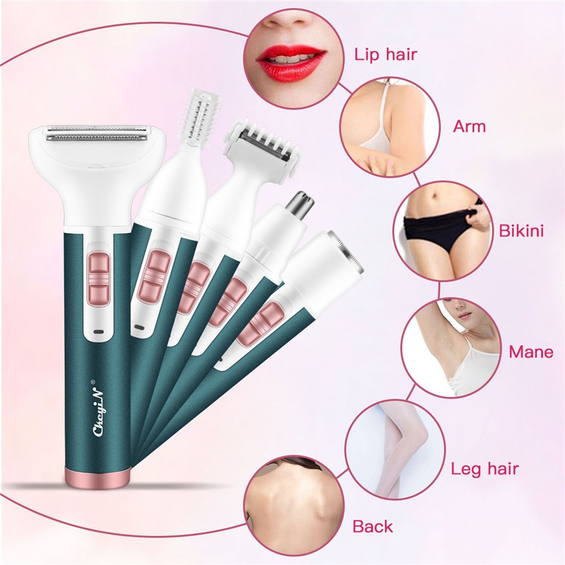Đặc điểm: Bộ dụng cụ tẩy lông cho phụ nữ: Bao gồm 5 đầu tông đơ thay đổi. .Tông đơ / máy lông / tỉa lông mày / dao xoay / dao cắt để đáp