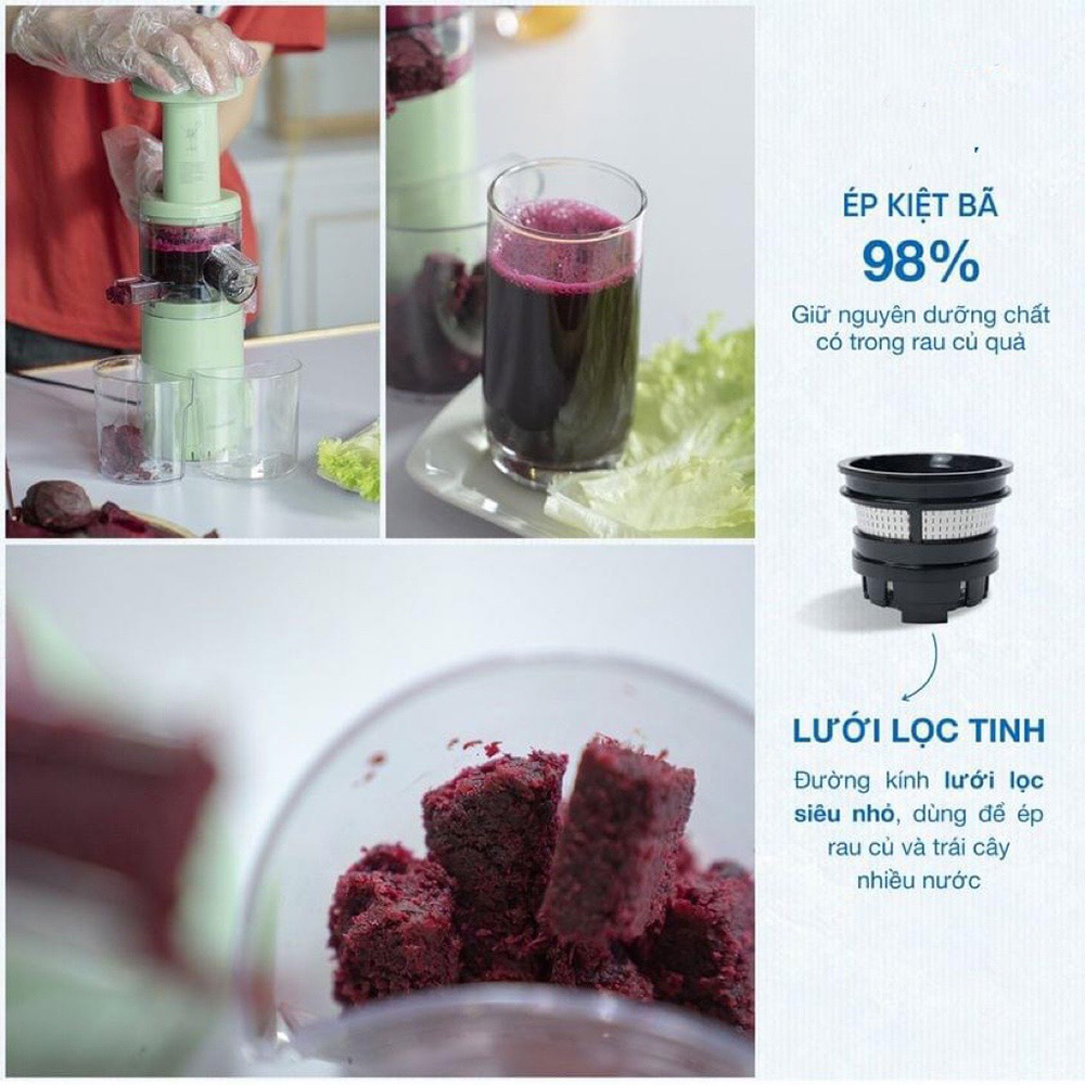 THÔNG TIN SẢN PHẨM - Khay ép cực lớn - Ép được 95% lượng nước từ rau quả - Lượng nước gấp đôi máy ép thường - Không lẫn bã vào nước - Vòng quay