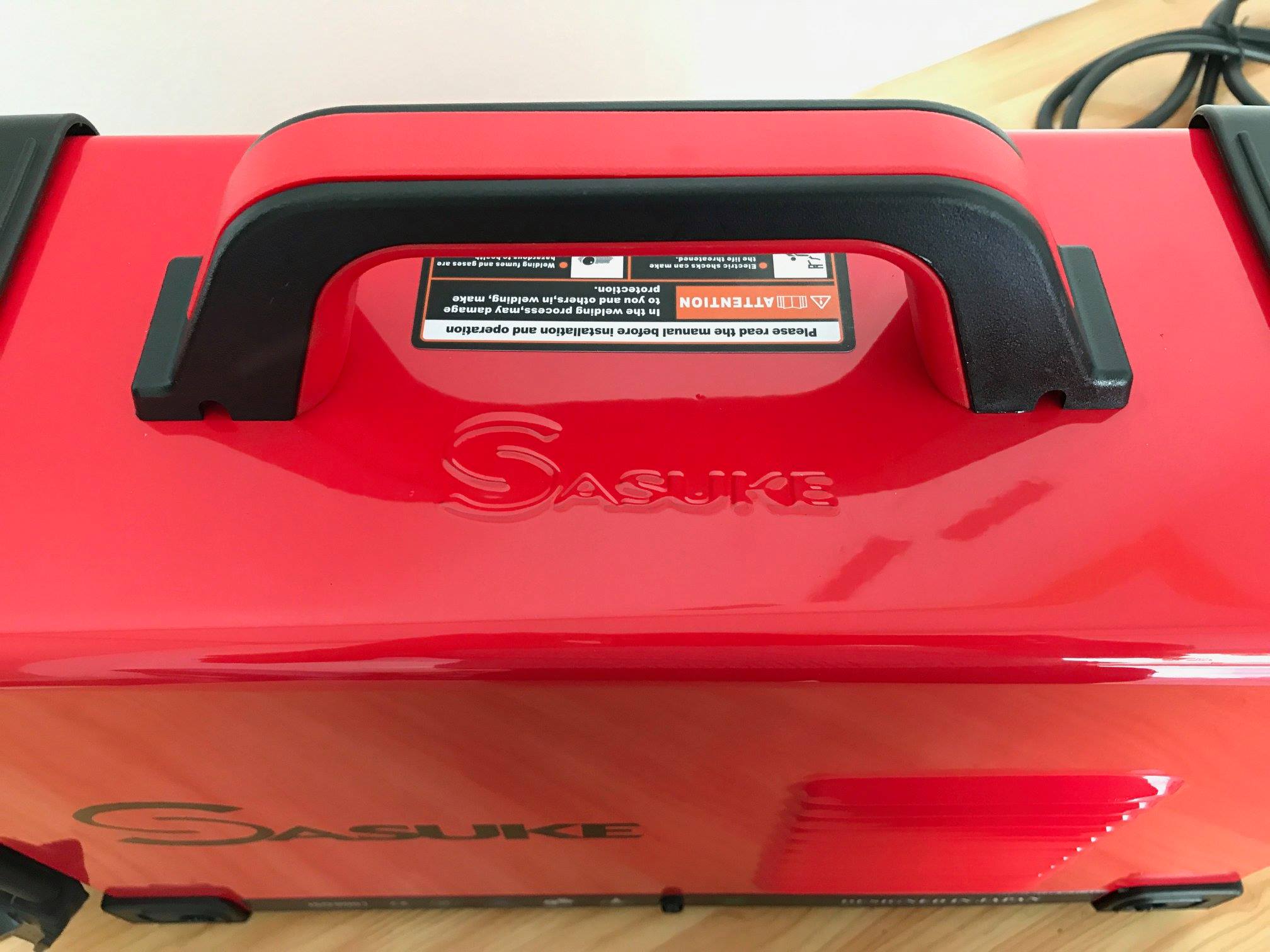 Trên vỏ máy hàn có in logo Sasuke, cấu trúc máy chắc chắn, kết nối dây hàn và kẹp mass dễ dàng.
