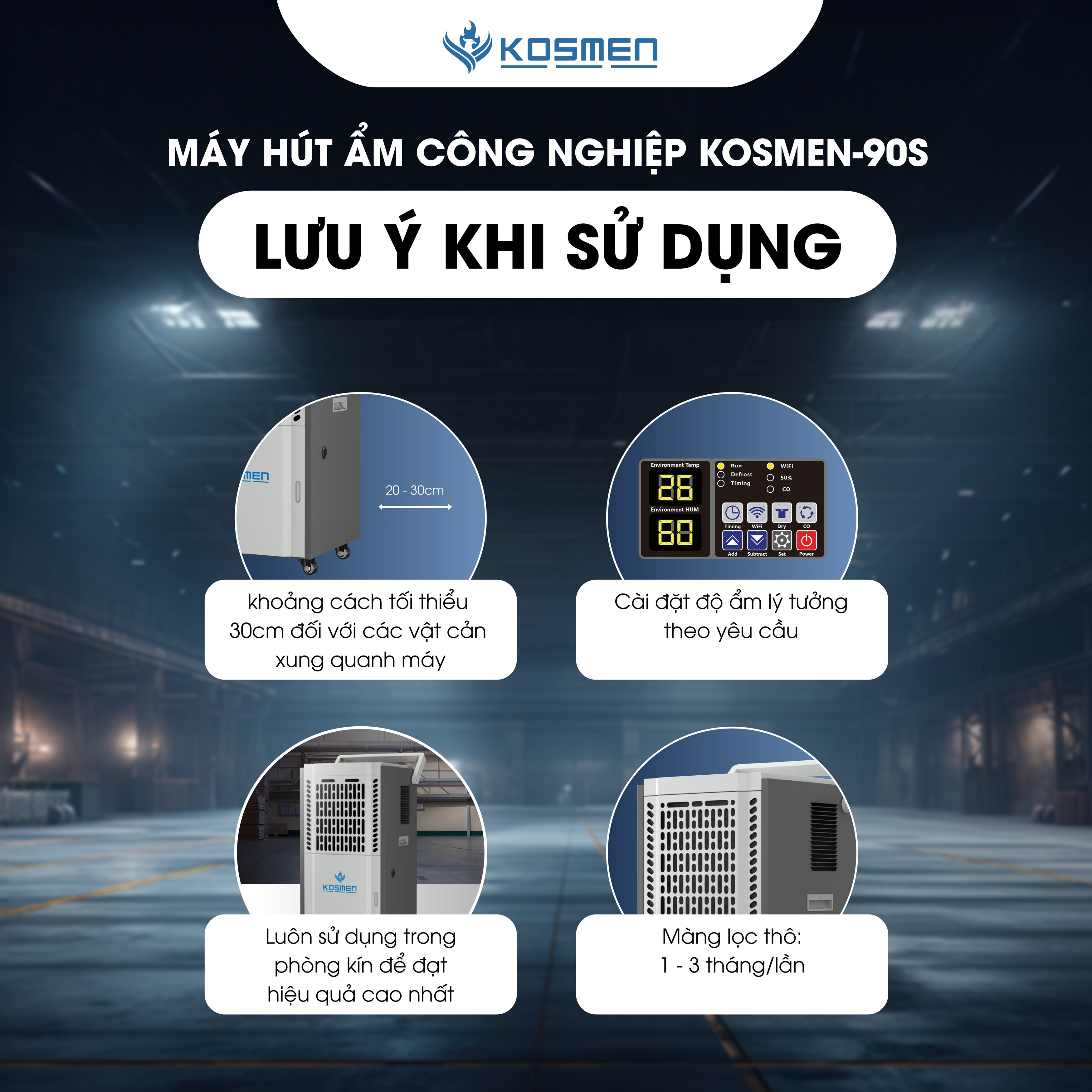 Máy hút ẩm công nghiệp Kosmen KM-90S là thiết bị xử lý ẩm đến từ Đức, phù hợp với các kho hàng, kho nguyên liệu,ện tích dưới 120m². Dễ dàng lắp đặt, sử dụng với