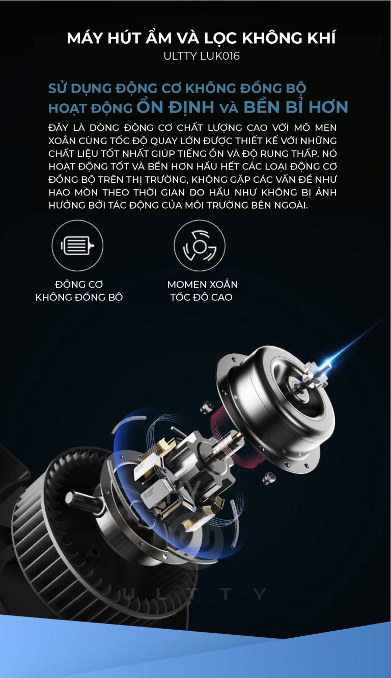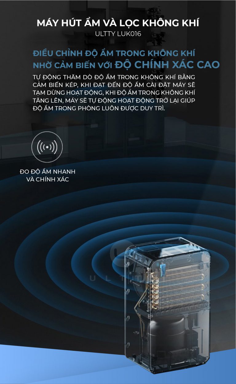 Máy hút ẩm và lọc không khí Ultty Luk016 là phiên bản mới được nâng cấp từ Ultty Luk012, giá tiền không đổi nhưng được trang bị thêm nhiều tính năng vượt trội MÁY HÚT ẨM VÀ LỌC KHÔNG KHÍ ULTTY LUK016 – XÓA TAN NỖI LO KHI TRỜI NỒM ẨM! Công nghệ nén khí hiện đại bậc nhất cho hiệu suất siêu vượt trội, loại bỏ 16-20l độ ẩm/ngày Máy hút ẩm và lọc không khí Ultty Luk016 sử dụng công nghệ hiện đại bậc nhất, kết hợp giữa máy nén khí và piston nén khí siêu êm ái, cho hiệu suất mạnh mẽ, loại bỏ 16-20 lít (30 ℃/86 ℉, 80% RH) độ ẩm trong không khí mỗi ngày (vượt trội hơn so với phiên bản cũ Luk012 12-16l), thích hợp cho cho không gian lên đến 35m²/400sq.ft. Tác dụng khi sử dụng Máy hút ẩm và lọc không khí Ultty Luk016: