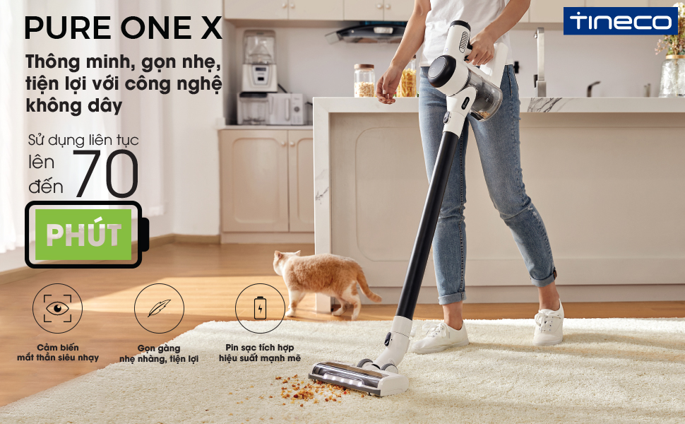 Pure One X là máy hút bụi không dây thông minh được tối ưu hóa cho khả năng hút siêu êm nhưng mạnh mẽ với thời gian chạy kéo dài lên đến 70 phút. Máy có Công nghệ cảm biến thông minh iLoop của Tineco, cảm biến ẩn bụi bẩn và mảnh vụn trên sàn nhà của bạn và tự động điều chỉnh công suất hút để làm sạch hoàn toàn thảm và sàn cứng.