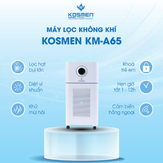 Máy lọc không khí Kosmen KM-A65 được áp dụng các công nghệ hiện đại đến từ Đức có tác dụng lọc sạch các loại bụi mịn, phấn hoa, nấm mốc, lông thú cưng và giúp