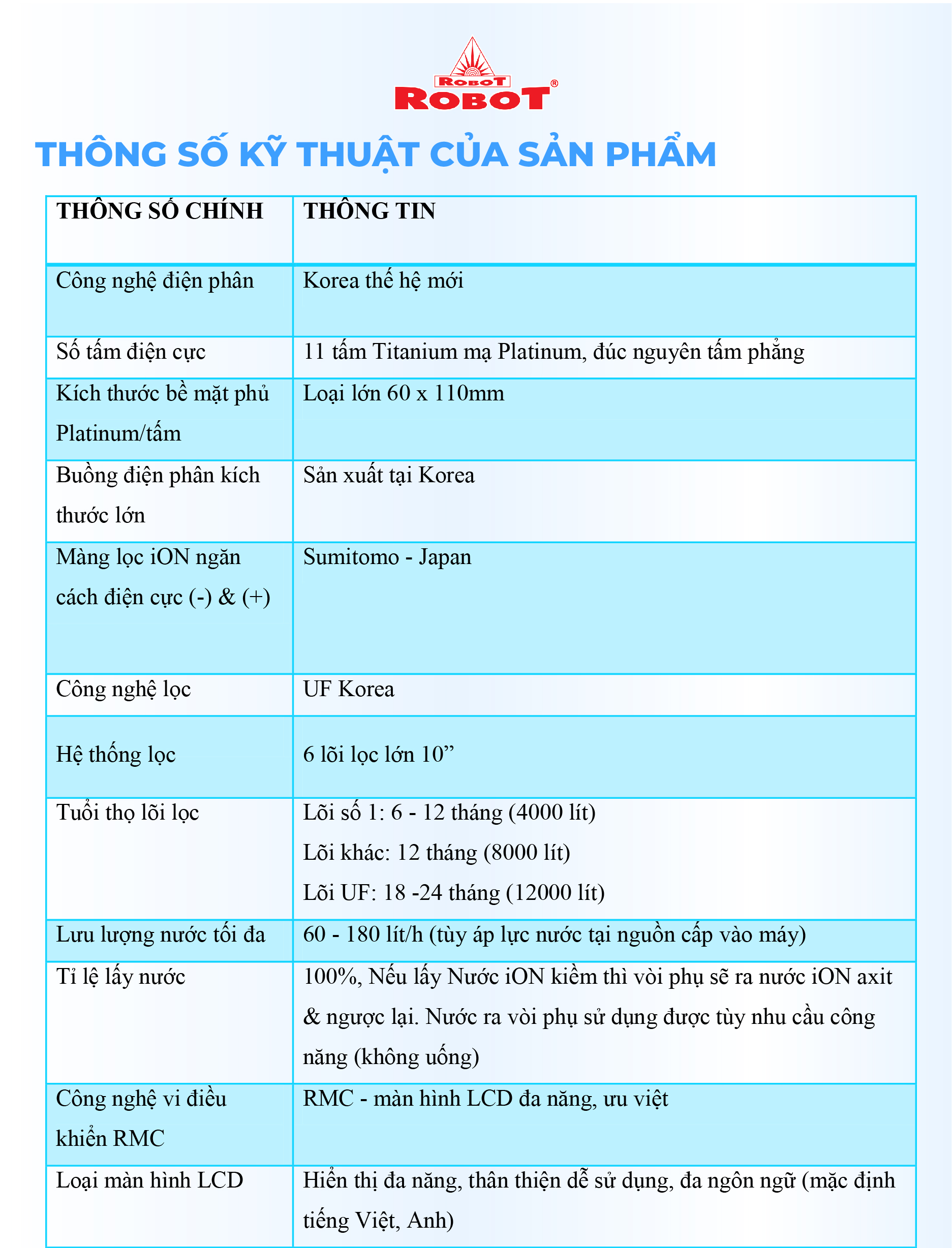 - Kiểu lắp đặt: Tủ đứng - Loại máy: Máy lọc nước RO hydrogen ion kiềm - Công nghệ lọc: RO kết hợp điện phân tạo nước ion kiềm - Số lõi lọc: 7 lõi - Lõi lọc thô: - Lõi 1: PP 5 micron (Sx Việt Nam) - Lõi 2: Than hoạt tính (Sx Việt Nam) - Lõi 3: Lõi Cation (Sx Việt Nam) - Lõi 4: PP 1 micron (Sx Việt Nam) - Lõi RO/Nano/UF: - RO 100 GPD sản xuất Hàn Quốc - Lõi chức năng: - Lõi 6: OrpH Hydrogen (Sx Việt Nam)Lõi 7: Nano Carbon (Sx Việt Nam) - Bảng điều khiển: Không có - Chỉ số nước: pH Không - Dung tích bình chứa: 6 lít - Tỉ lệ lọc - thải: Lọc 4.8 - Thải 5.2
