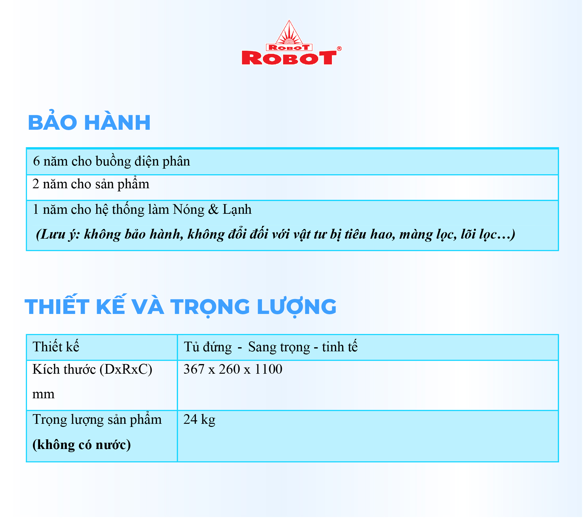Tổng quan - Kiểu lắp đặt:Tủ đứng - Loại máy:Máy lọc nước RO nóng nguội lạnh - Công nghệ lọc:Thẩm thấu ngược RO - Kháng khuẩn:Nano Silver - Dung tích bình chứa:Tổng 7.8 lít (Nước nóng 0.8 lít, nước lạnh 1 lít, nước thường 6 lít) - Tỷ lệ lọc - thải:Lọc 4.8 - Thải 5.2 (Tỷ lệ này phụ thuộc vào chất lượng nước đầu vào) - Công suất lọc:18 lít/giờ - Công suất tiêu thụ điện trung bình khoảng:0.628 kW/h - Nhiệt độ nước hãng công bố:Nóng 80 - 90°C, Lạnh 10°C - Nhiệt độ nước thực tế:Nóng 80 - 90°C, Lạnh 10°C - Áp lực nước yêu cầu:0.07 - 0.25 MPa - Nơi sản xuất máy bơm:Trung Quốc - Năm ra mắt:2023 - Thương hiệu:Việt Nam - Nơi sản xuất:Việt Nam Thông tin lõi lọc - Số lõi lọc:10 lõi -
