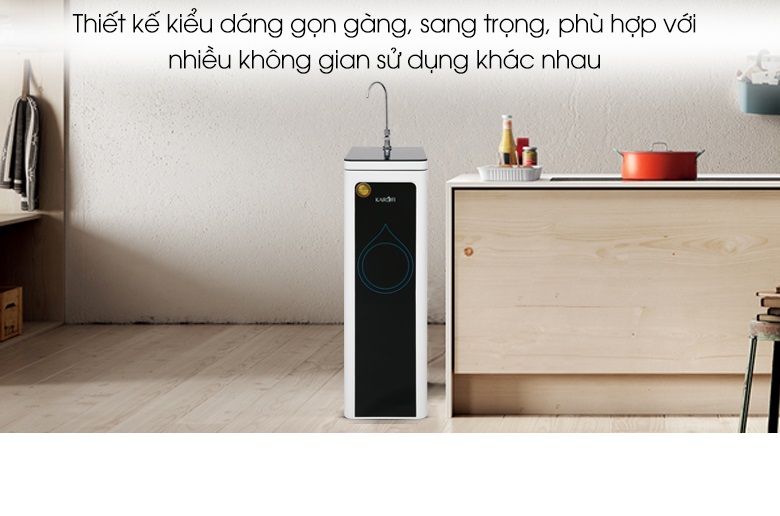 Kiểu dáng tủ đứng thon gọn tô điểm cho không gian hiện đại hơn Máy lọc nước RO Hydrogen nóng nguội 10 lõi Karofi KAH-D10 có kiểu dáng tủ đứng thon gọn, tiết kiệm diện tích