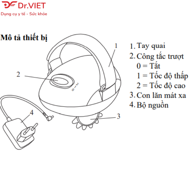 Trọn bộ sản phẩm: Máy mát xa, Bộ nguồn, Hướng dẫn sử dụng.